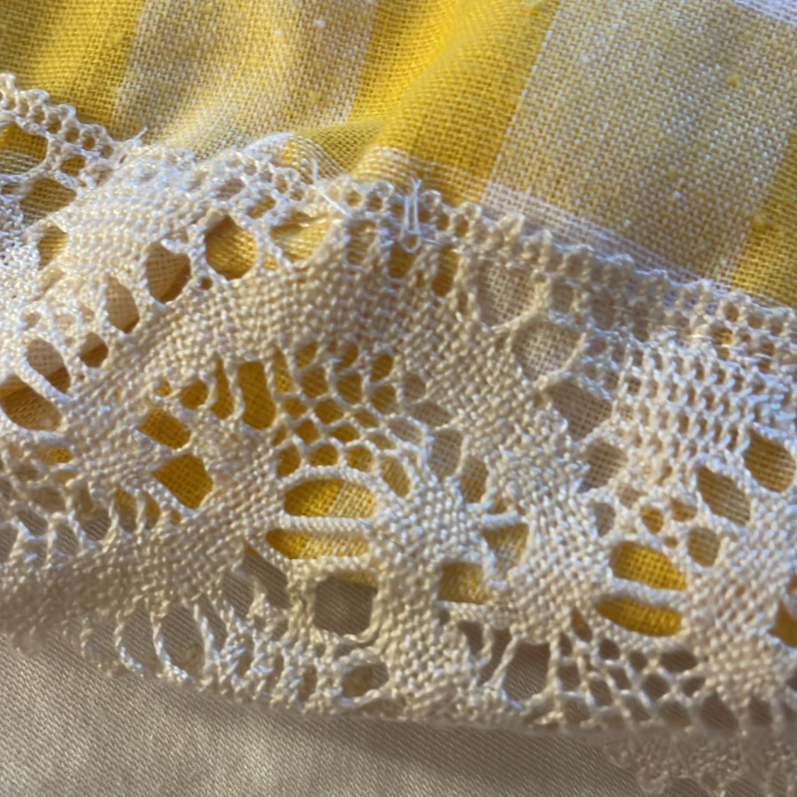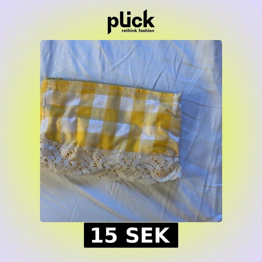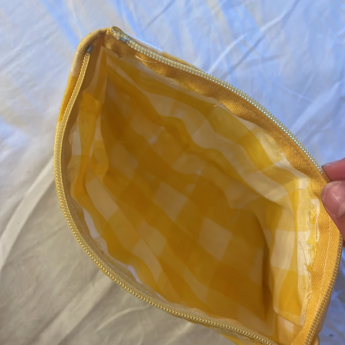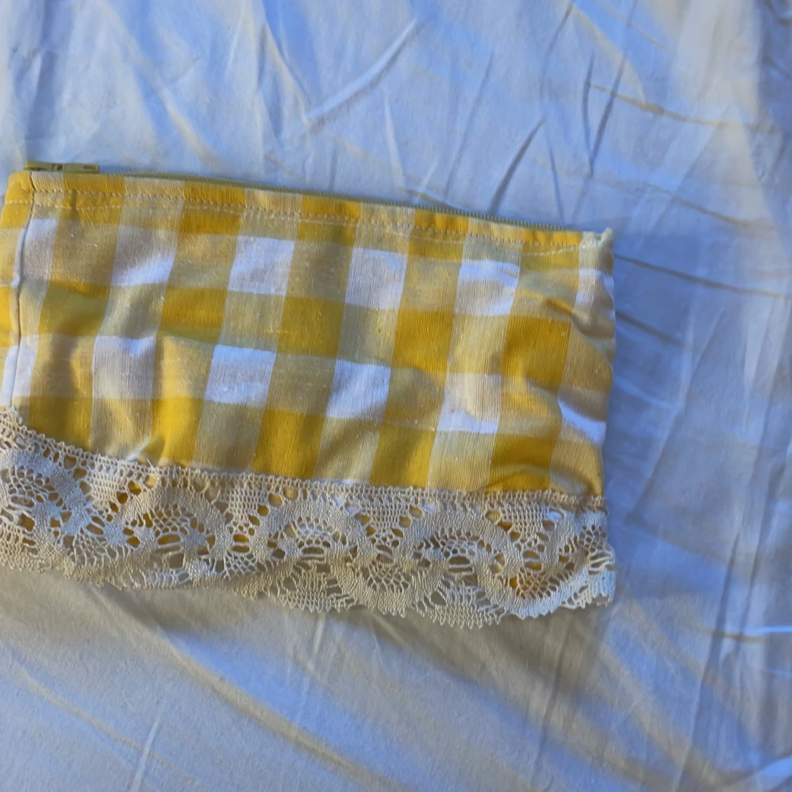 Söt kuvertväska i gul och vit rutig bomull med dragkedja upptill. Väskan har en dekorativ spetskant i vitt längs nederkanten som ger en vintagekänsla. Perfekt för att förvara småsaker eller smink i väskan.