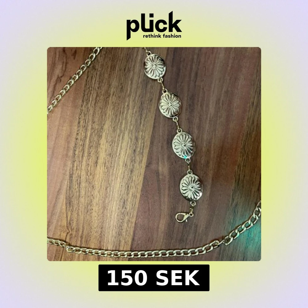 Säljer ett snyggt guldfärgat kedjebälte med dekorativa blommönstrade medaljonger. Bältet har en kedja med karbinhake och passar perfekt att styla över klänning eller jeans för en cool look. Metallmaterial och blommiga detaljer ger en unik touch.