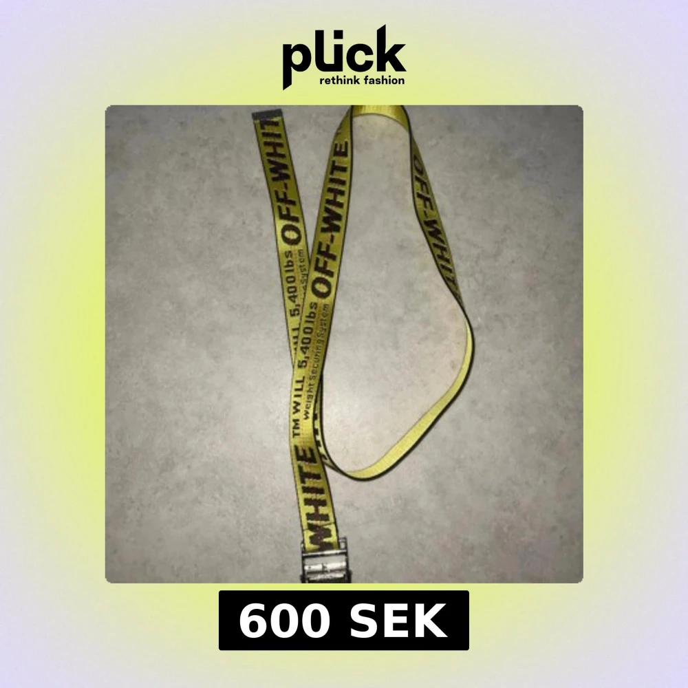 Säljer ett gult bälte från Off-White med svart text och metallspänne. Bältet har tydlig logga och industriell design. Använt enstaka gånger.