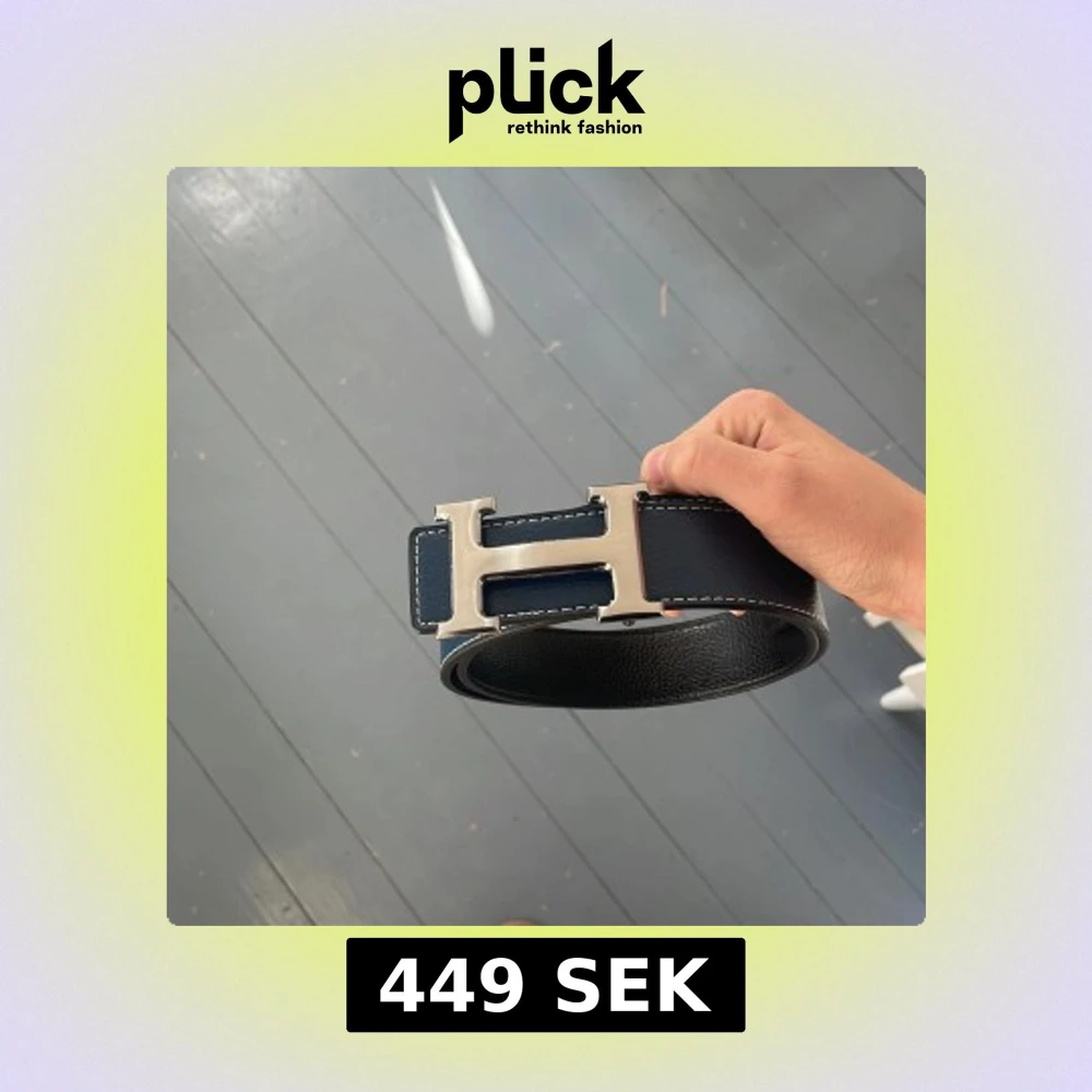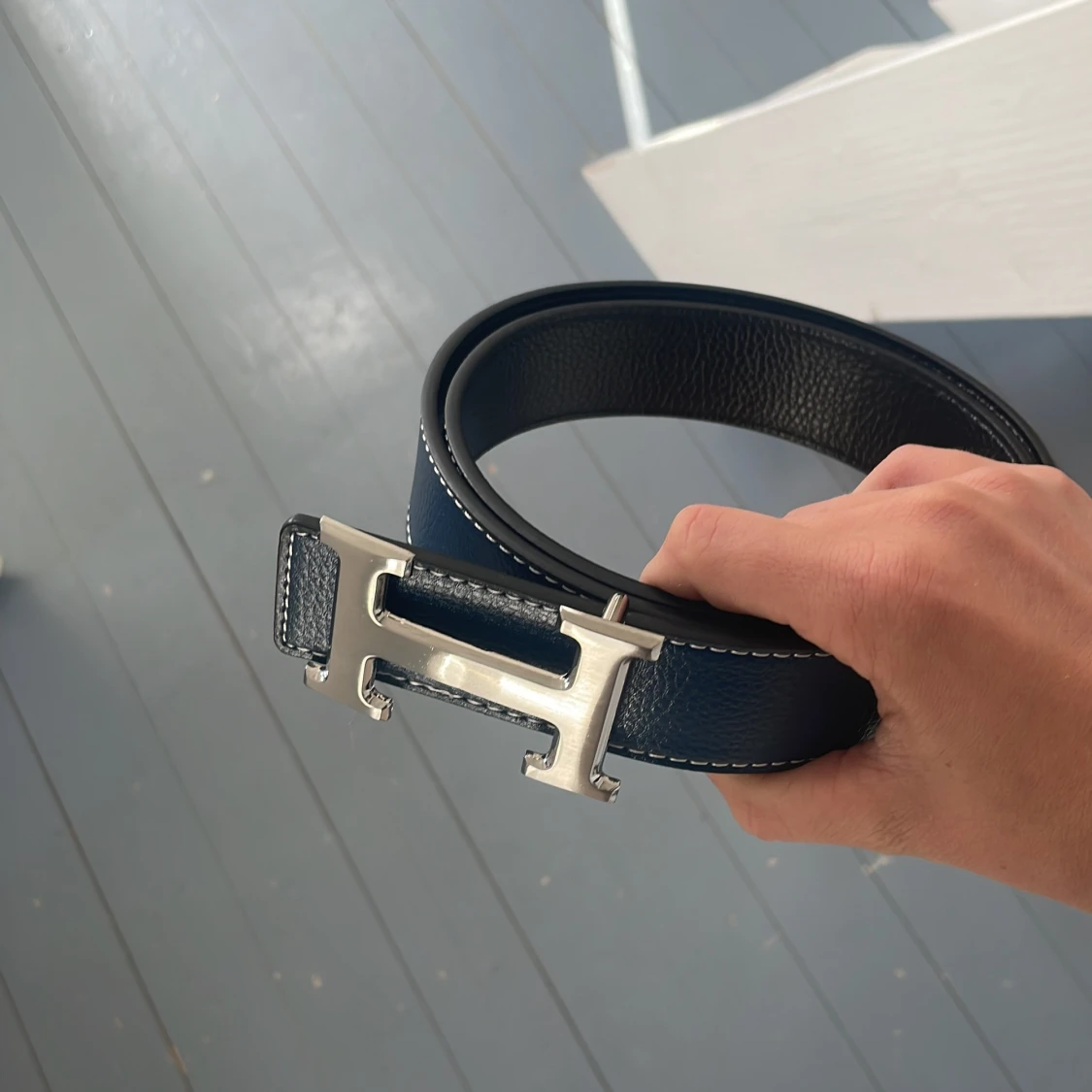 Snyggt svart skärp från Hmed ett stort, silverfärgat H-spänne. Bältet är gjort i skinn med vit kontrastsöm längs kanterna som ger en clean och exklusiv vibe. Perfekt accessoar för att lyfta din outfit med en lyxig touch.