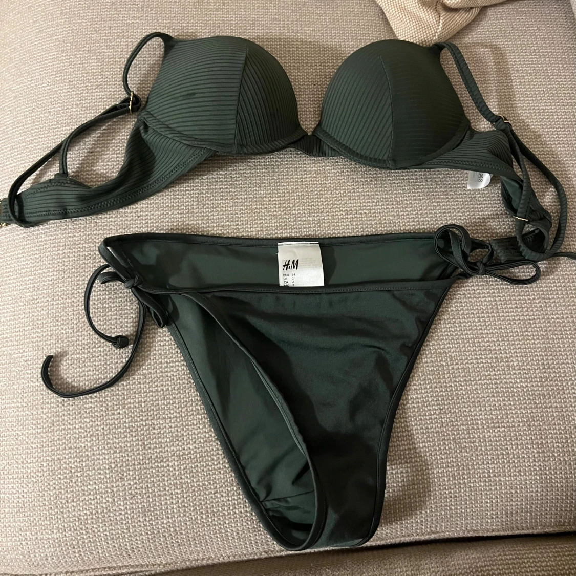 Snygg mörkgrön bikini från H&M med ribbad push-up överdel och klassiska bikinitrosor med knyt i sidorna. Perfekt för strandhäng och poolparty. Materialet är mjukt och följsamt syntet som torkar snabbt. Stilren och enkel design som passar dig som gillar att sticka ut med färg. (Överdelen på bikinin är storlek 70B)