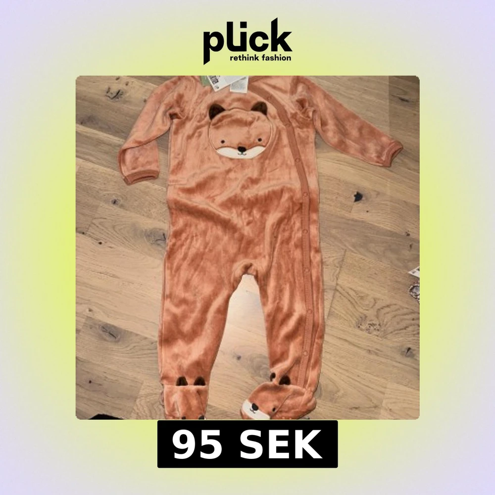 Söt orangefärgad baby jumpsuit med en räv/nalle ansikte på framsidan och fötterna. Plagget har knappar hela vägen ner på framsidan är varm och skön, i nyskick! Lätt att få på och av.