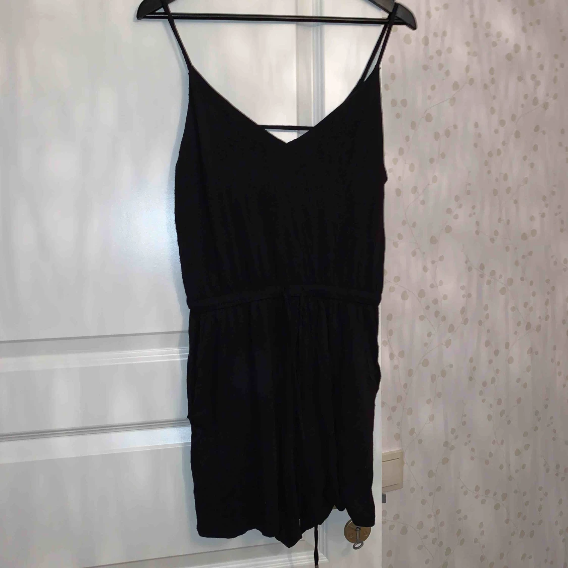 En svart jumpsuit med strechigt material, snörning i midjan och fickor fram, V ringning både bak också fram mycket bekväm och skön!