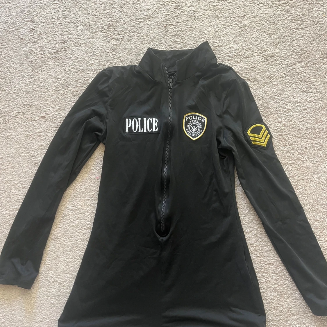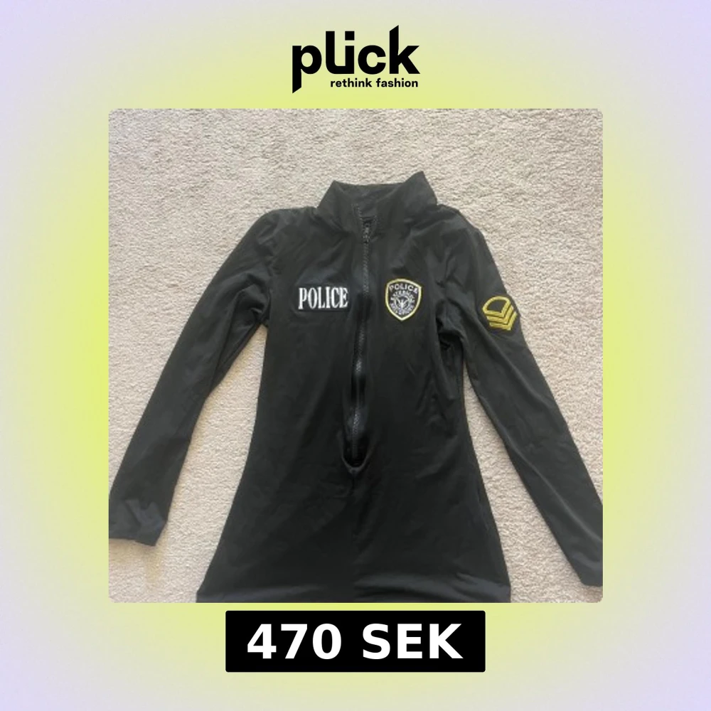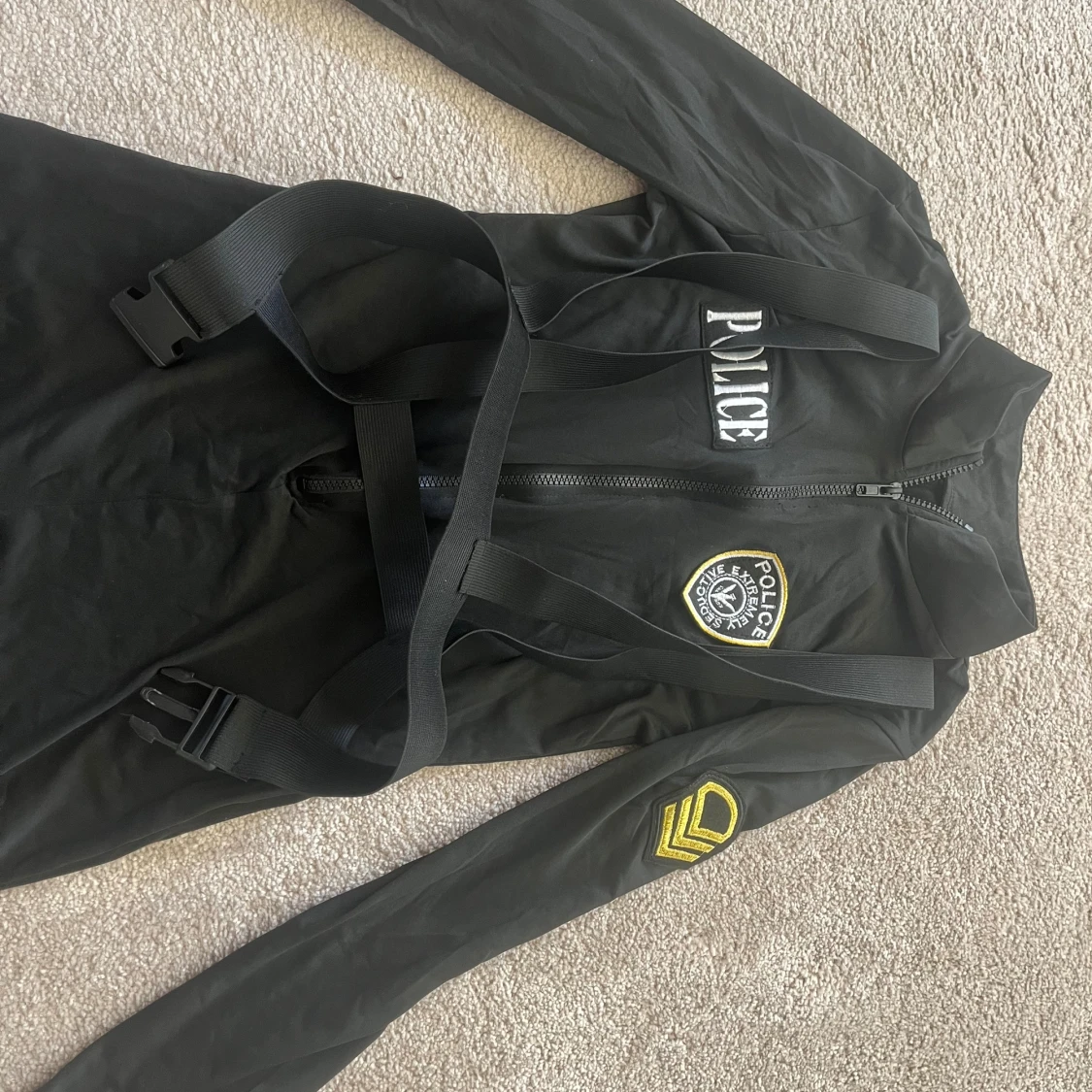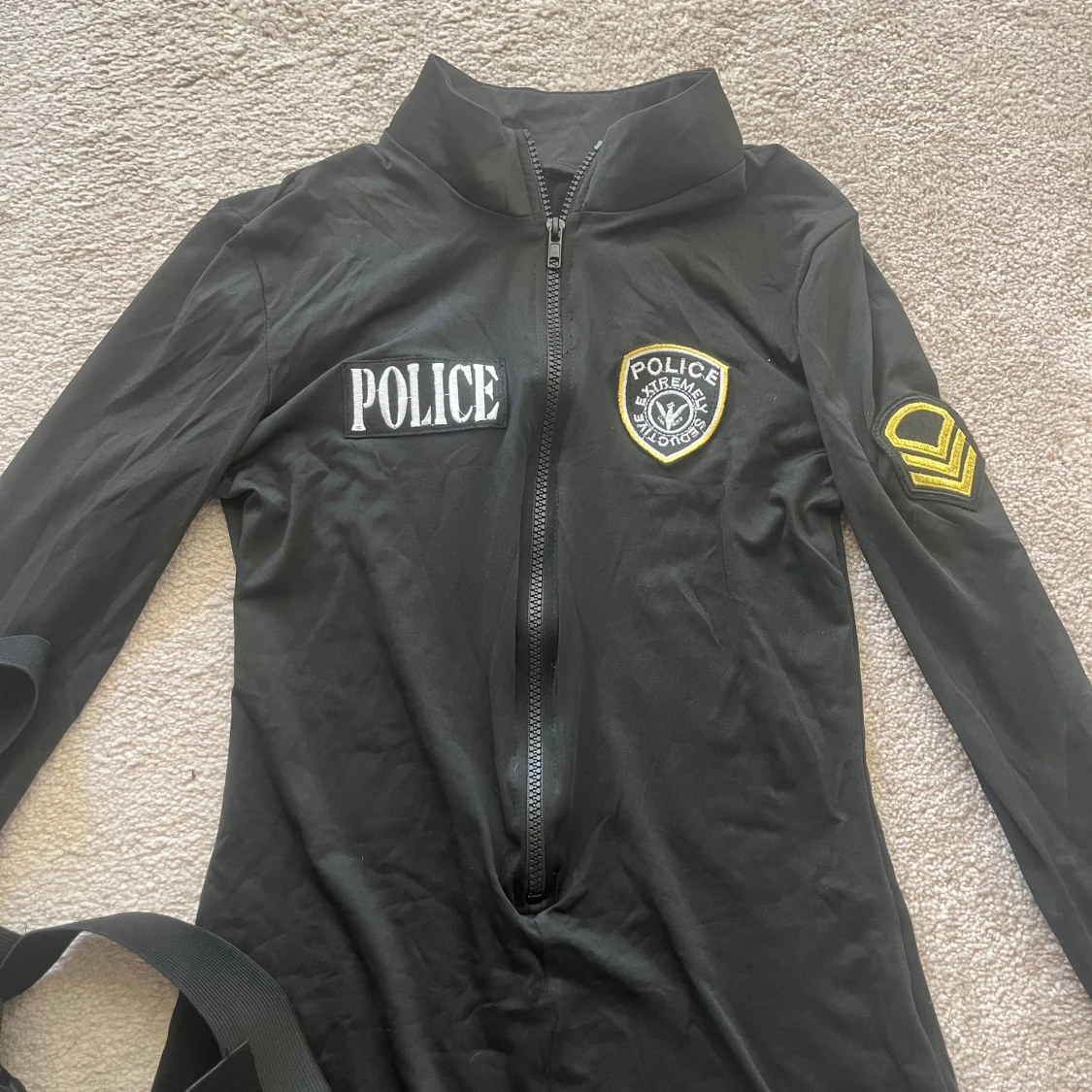Helt ny aldrig använd Polisdräkt till haloween med lång ärm och dragkedja framtill, dekorerad med broderade polispatchar och POLICE-tryck. Medföljer svarta bälten för extra detalj. Perfekt för temakväll eller maskerad! Materialet känns som polyester och har en slim passform.
