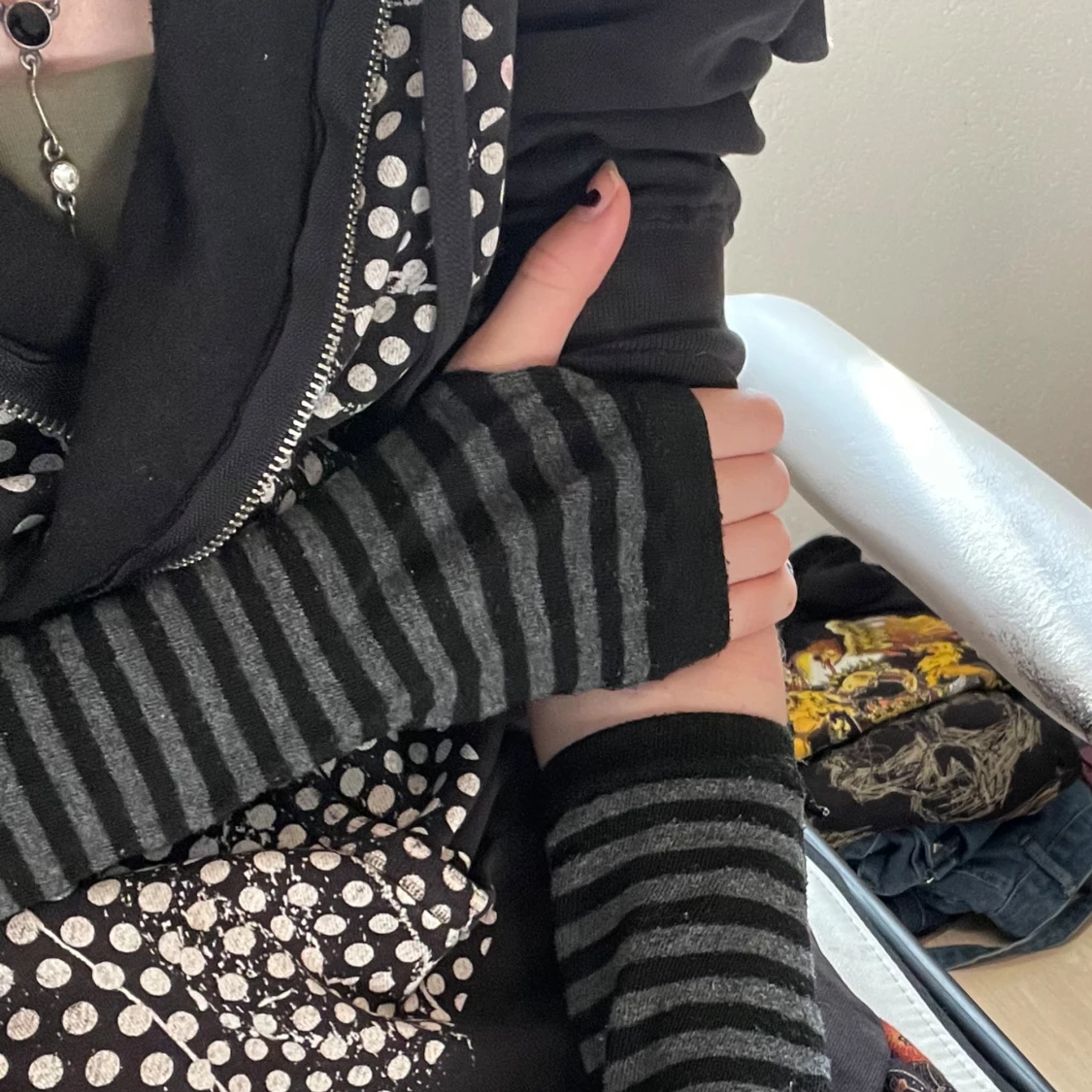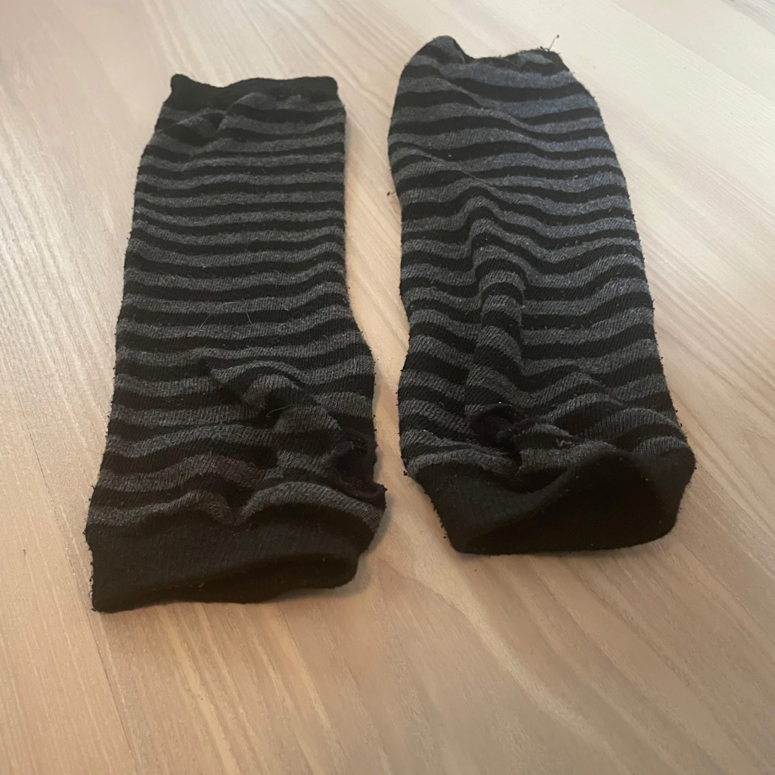 Mörkrandiga handledsvärmare som passar både för att värma eller att styla din outfit. De är snygga att styla med armband, men lika fina utan. För dig som gillar en grungie/punkig/emo look är detta en fin extra touch till dina outfits! Väl användna men hela utan hål eller upprepade sömmar