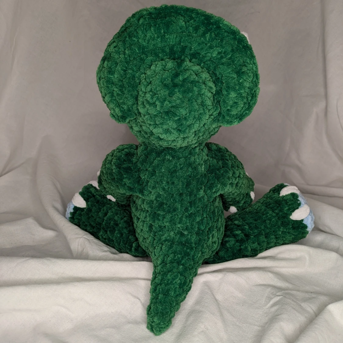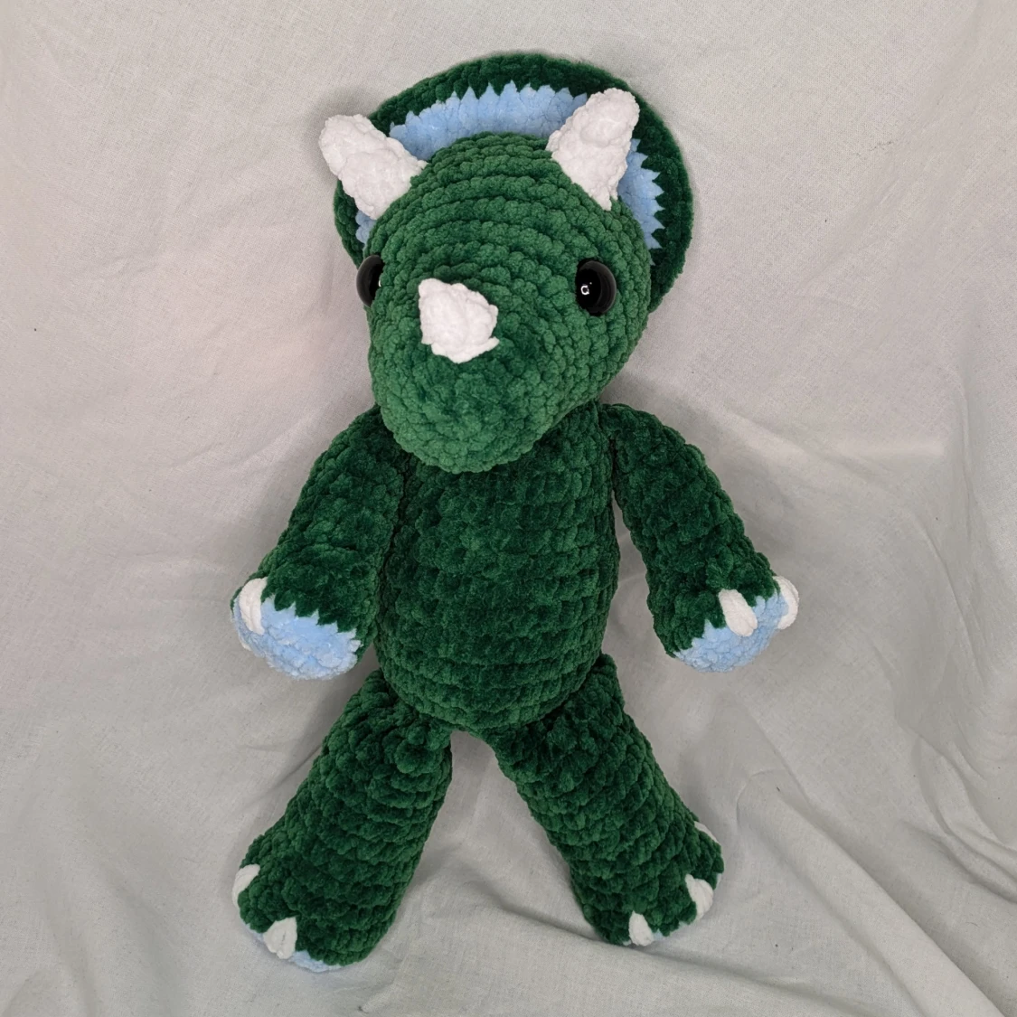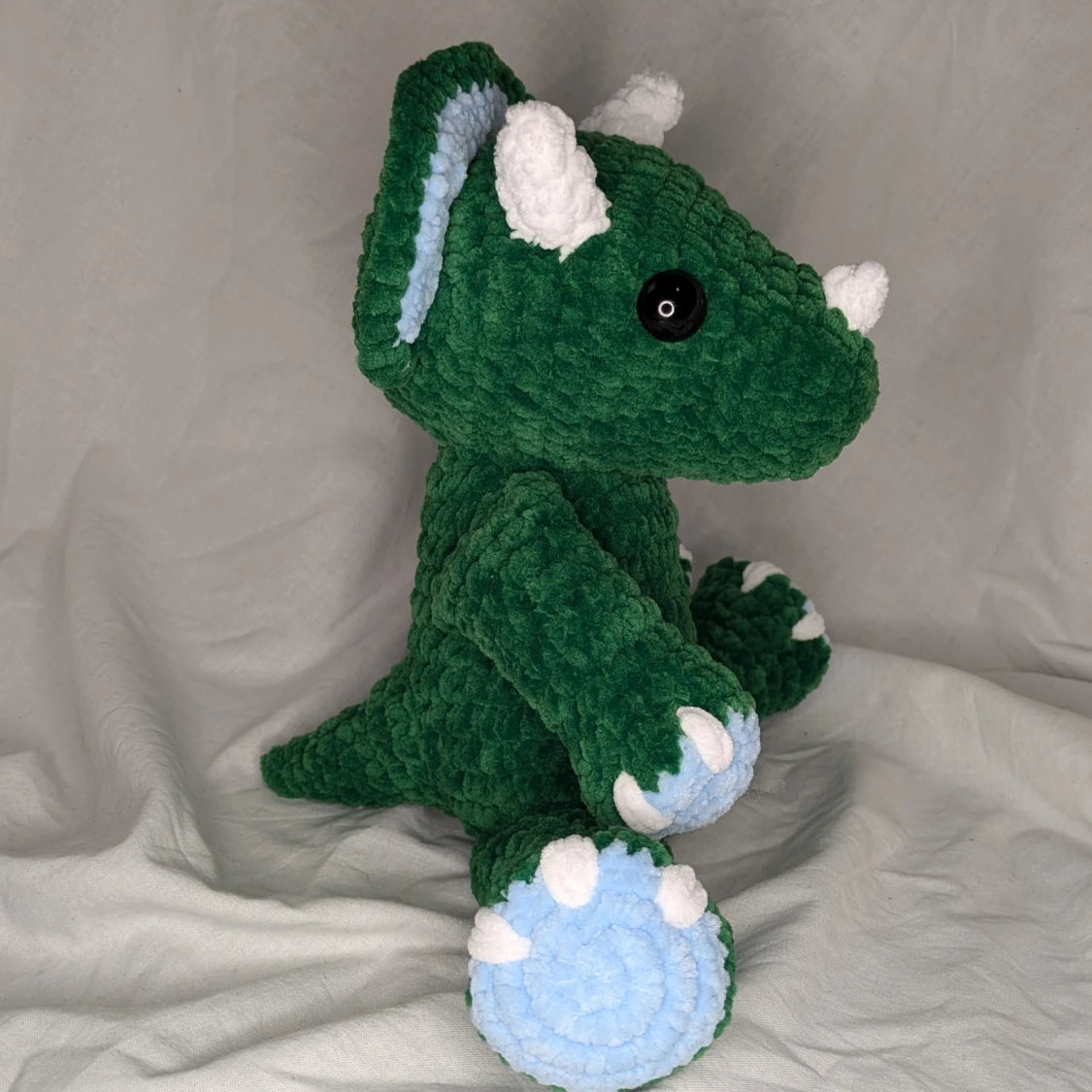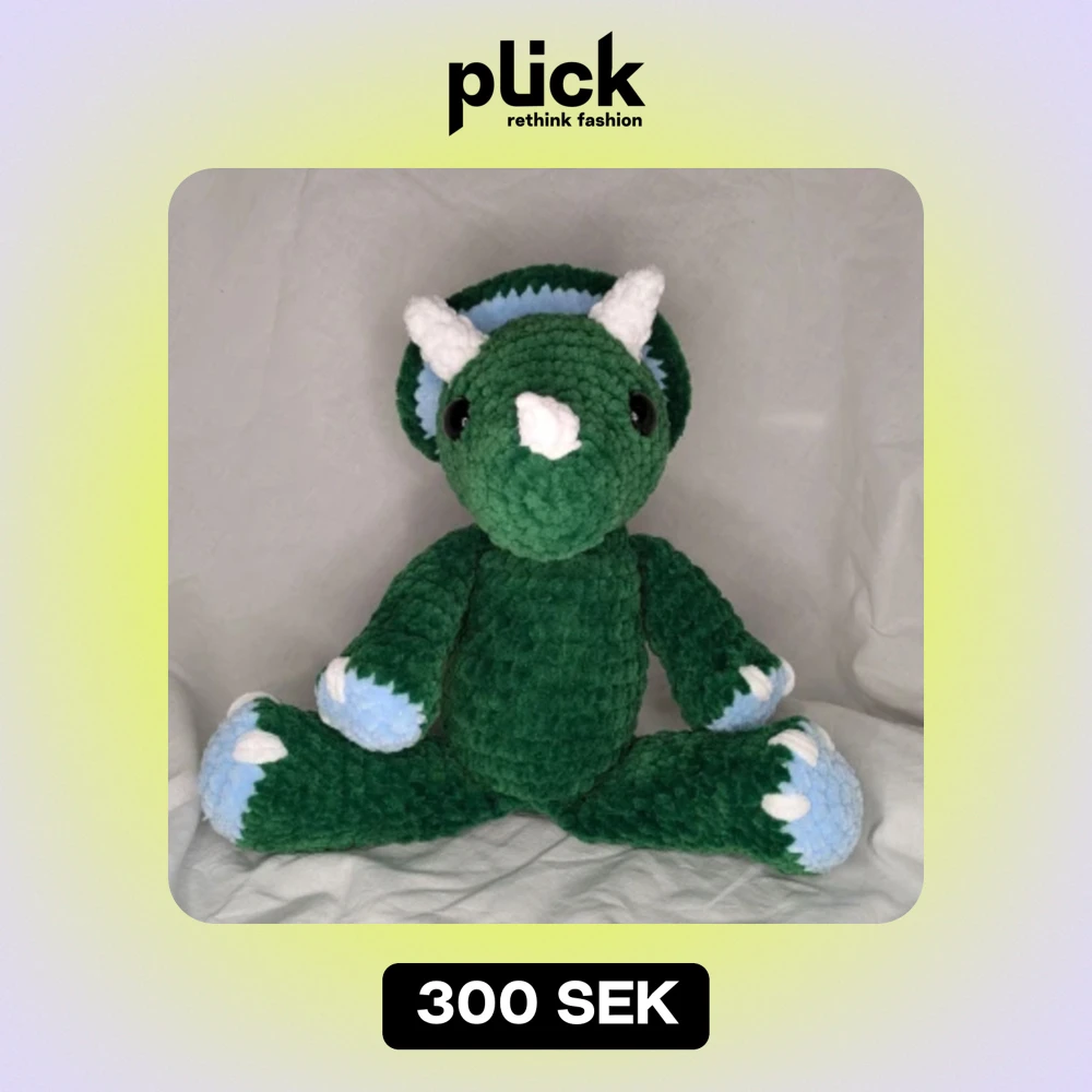 Kroppen: Höjd: 22cm Bred: 12cm Kroppen plus ben och armar: Höjd: 30cm Bred: 23cm Det är en egenvirkad triceratops som är gjord på fluffigt garn som är 100% polyester