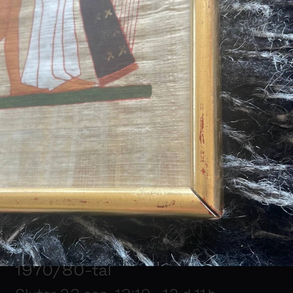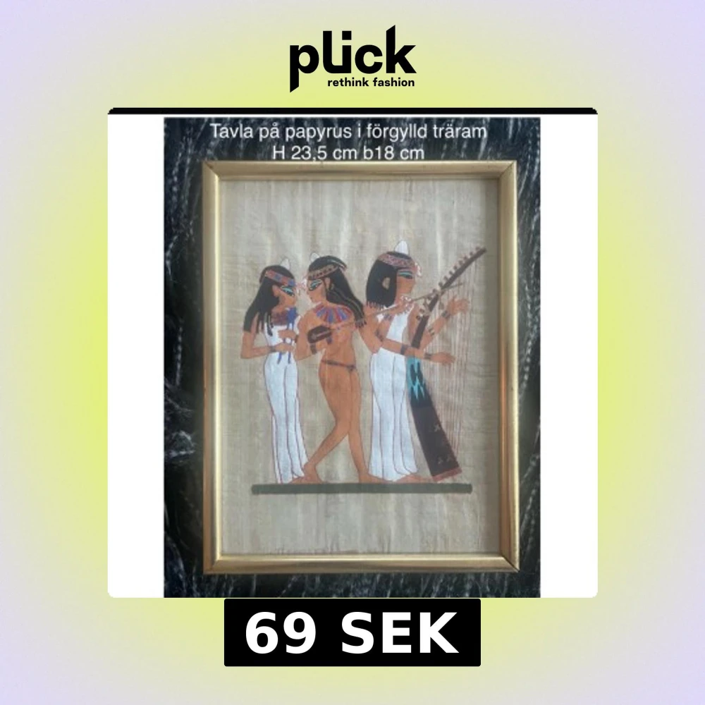 En vacker handmålad tavla utförd på äkta papyrus med ett klassiskt egyptiskt motiv. Den föreställer tre kvinnor som dansar och spelar instrument. Hathor var namnet på musiken, dansen och glädjens gudinna. Tavlan är i mycket gott skick och är den perfekta presenten till någon som samlar på egyptisk konst eller bara vill inreda med lite mer karaktäristiska detaljer i hemmet. Mått: H 23,5 cm B 18 cm
