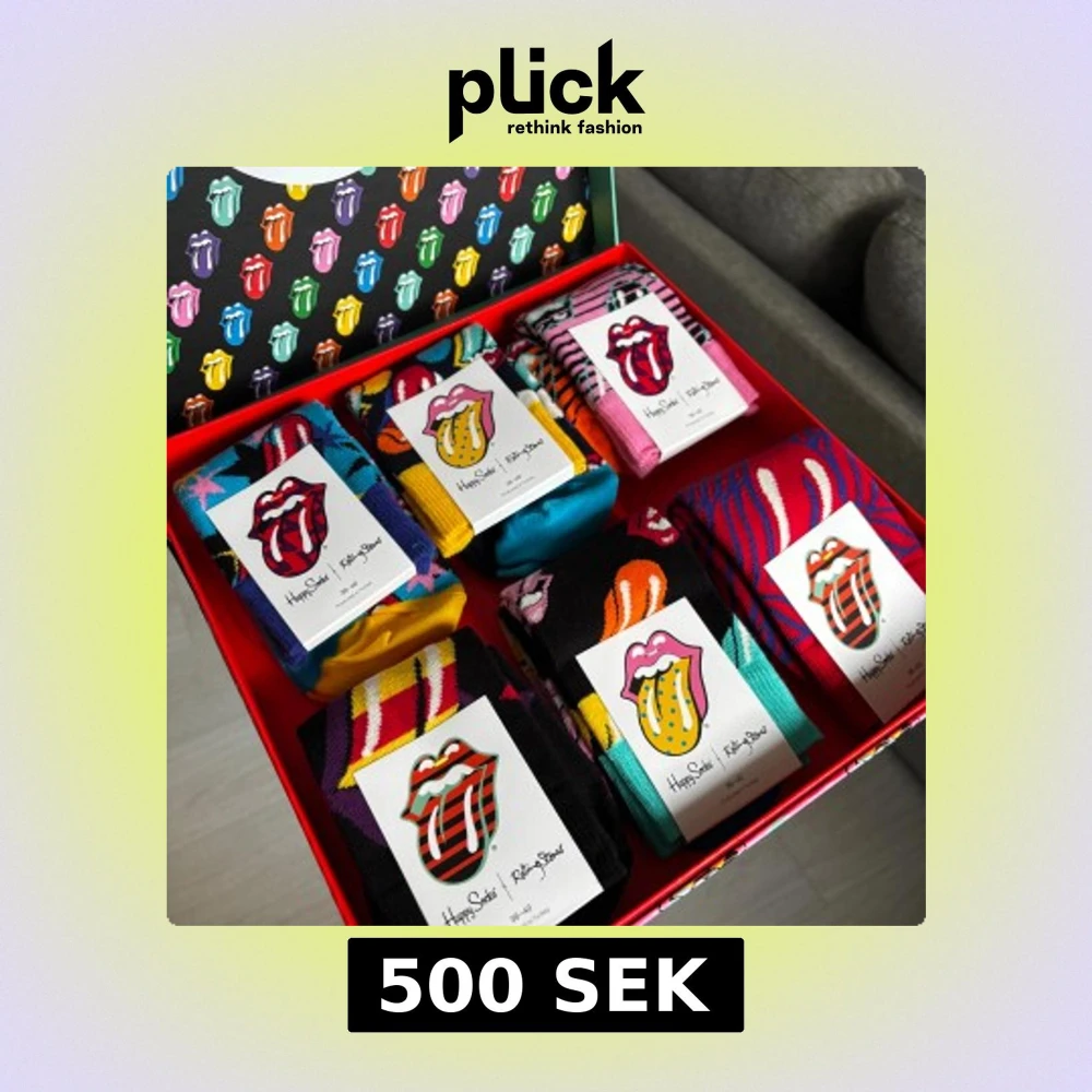Helt ny presentbox med 6 par Happy Socks x Rolling Stones. Alla strumpor är oanvända och i originalförpackning. Perfekt som present eller till dig själv- unisex Storlek 36-40 unisex