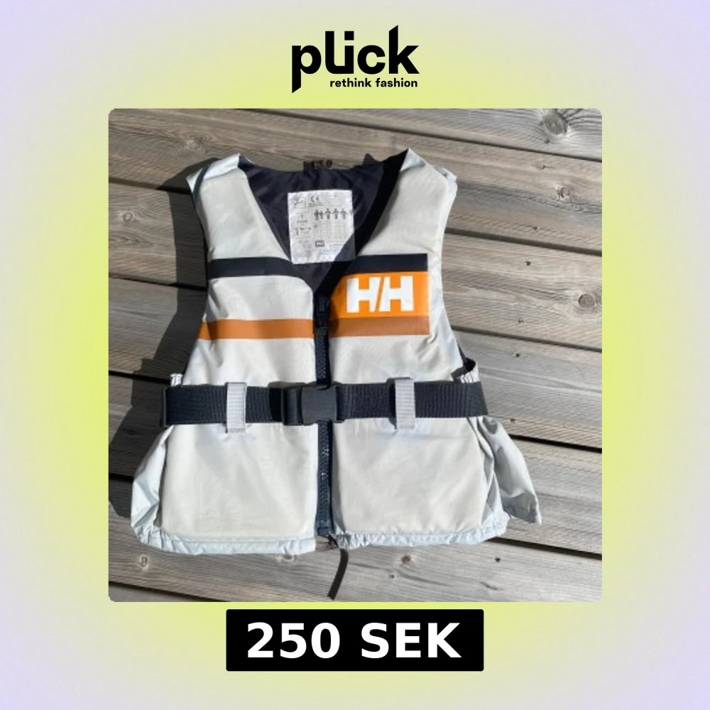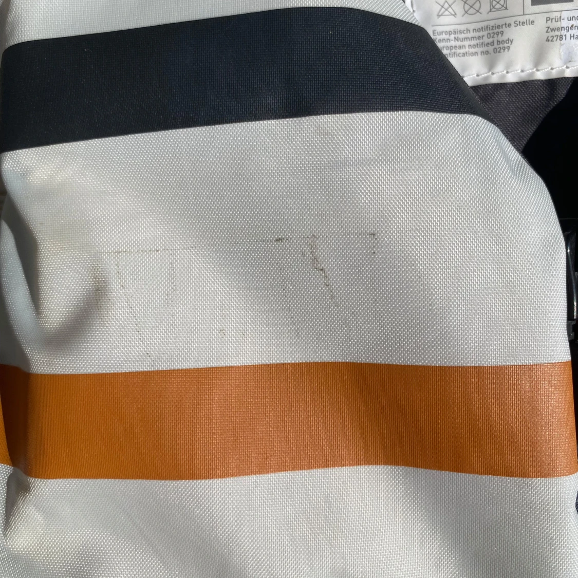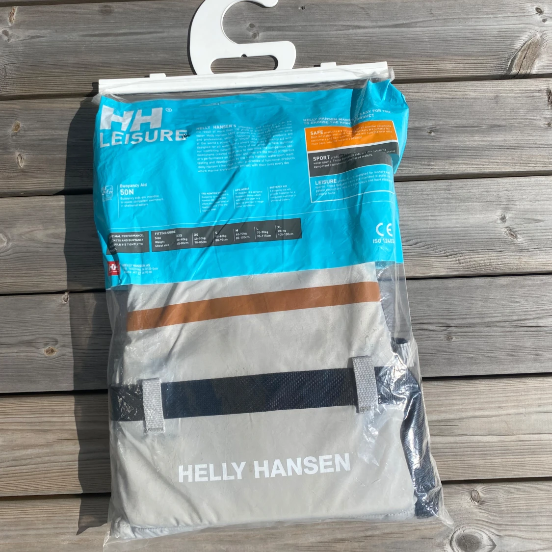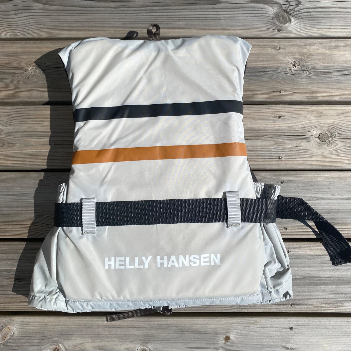 Snygg flytväst från Helly Hansen i ljusgrått med svarta och orangea ränder. Västen har ett justerbart midjebälte med spänne och dragkedja framtill. Knappt använd! Påse till flytvästen följer med😇Bild 4 visar en litet märke på ena bröstet.