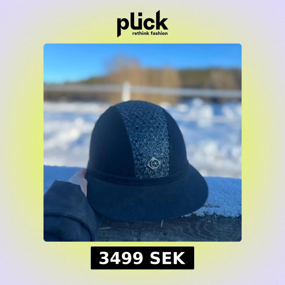 Snygg svart ridhjälm från Charles Owen med glittrig detalj på ovansidan. Stl 58, fint skick inte fått någon allvarlig smäll.