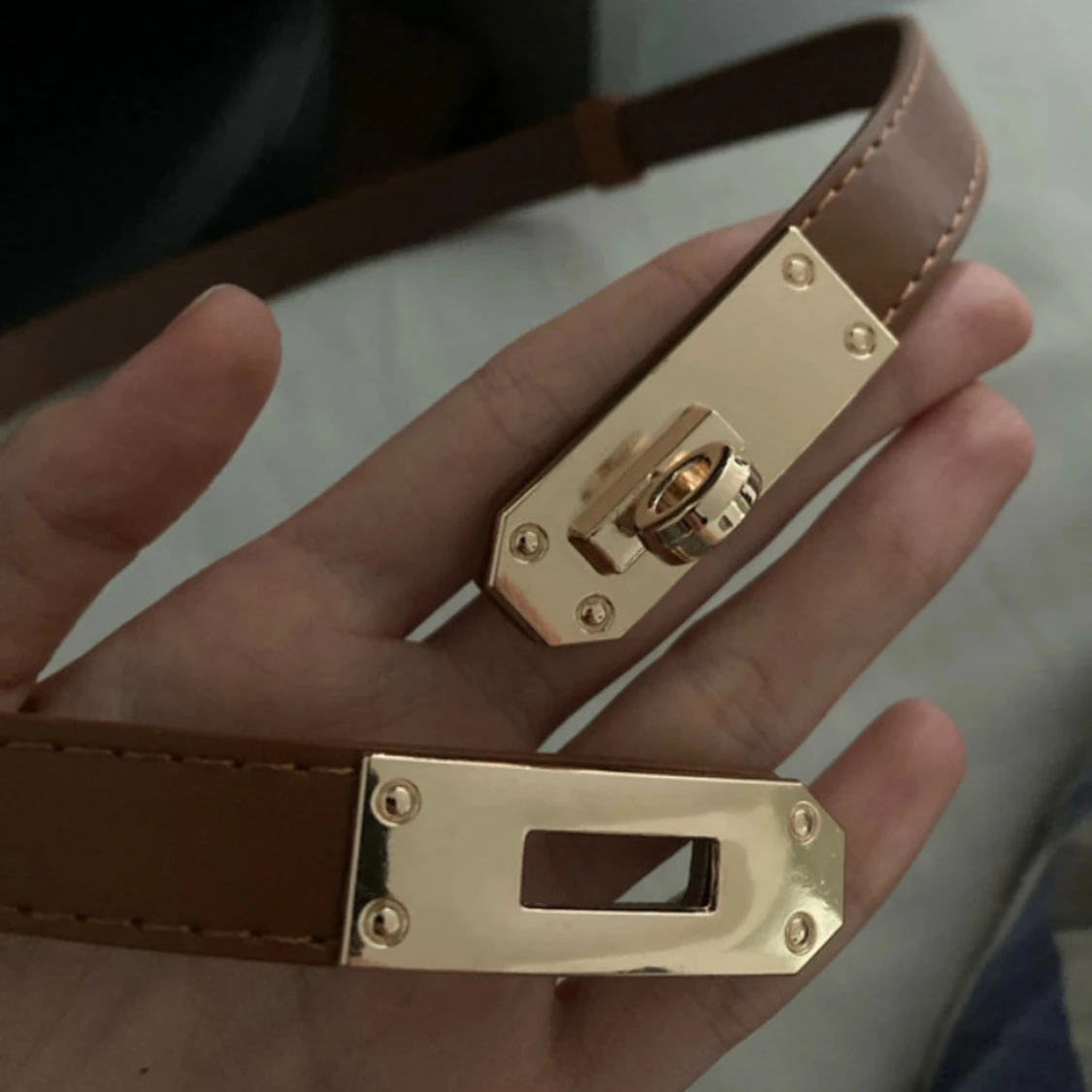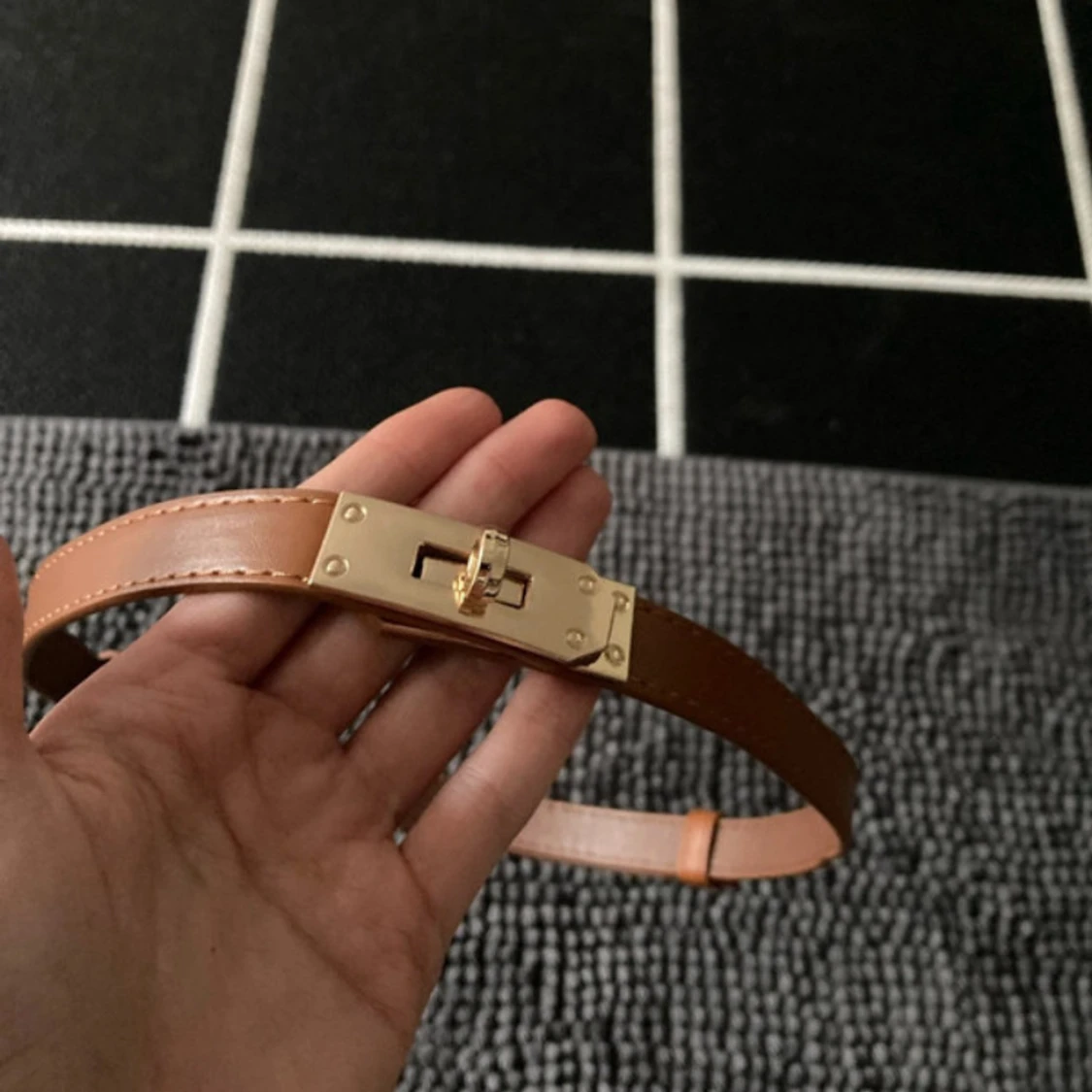 🤎 Stilrent, oanvänt bälte Elegant och smalt bälte i brunt, läderliknande material med guldfärgat spänne. Perfekt för att lyfta vilken outfit som helst passar lika bra till klänning som till jeans eller kjol. Justerbar storlek. Jag hade 2, men en är redan såld, nu finns bara 1 kvar Kontakta mig gärna vid frågor!