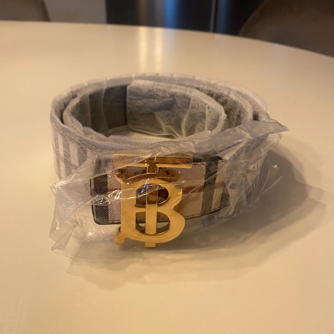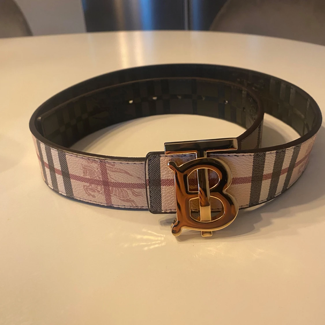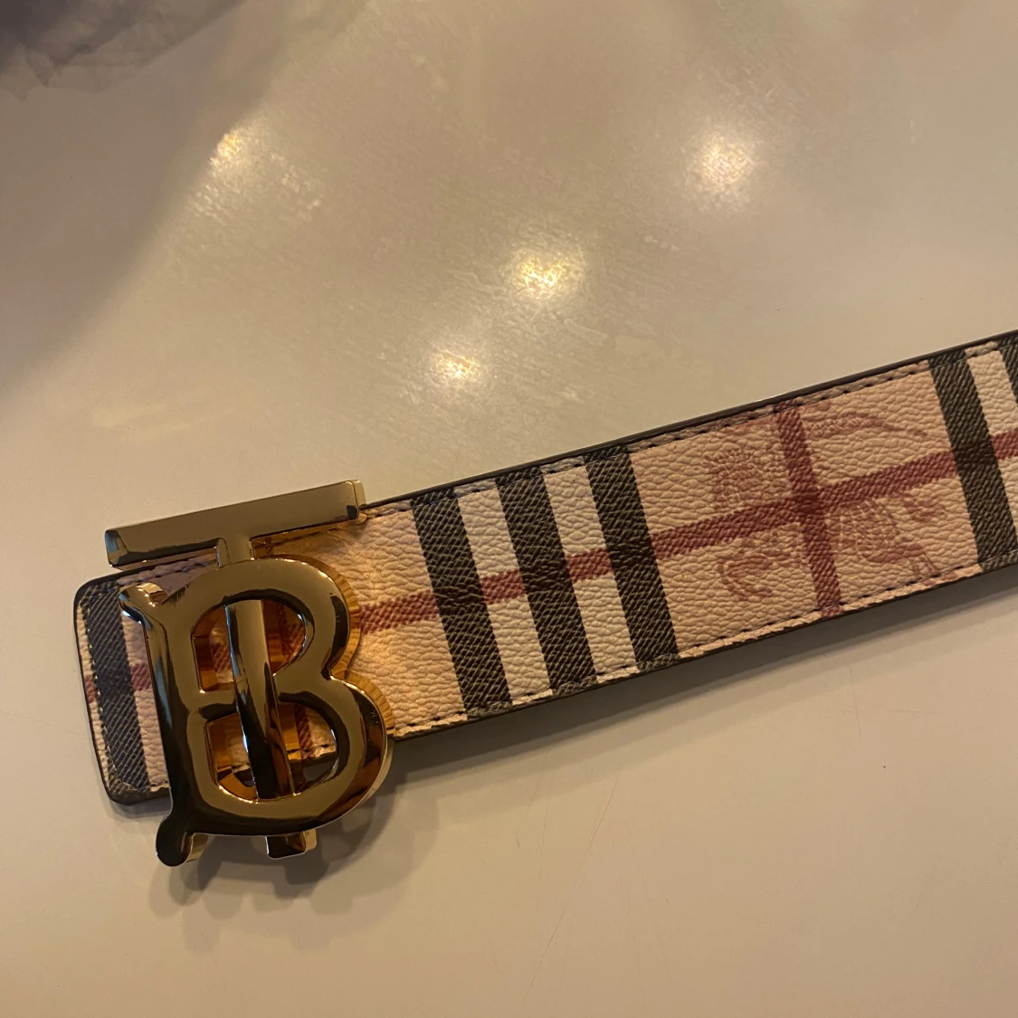 Helt nytt rutigt bälte med guldspänne.