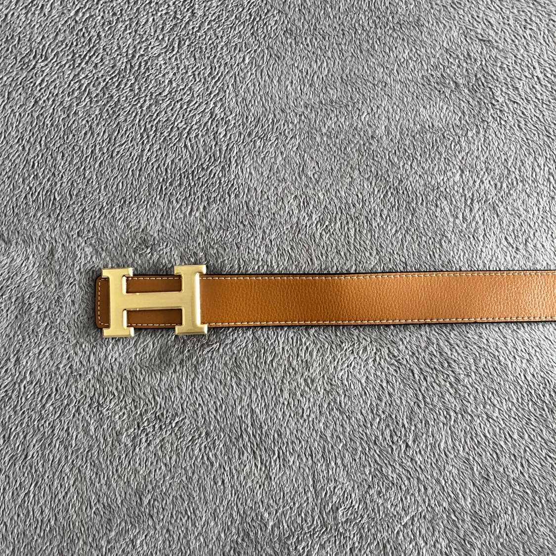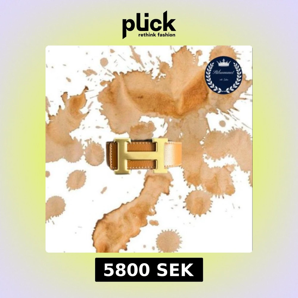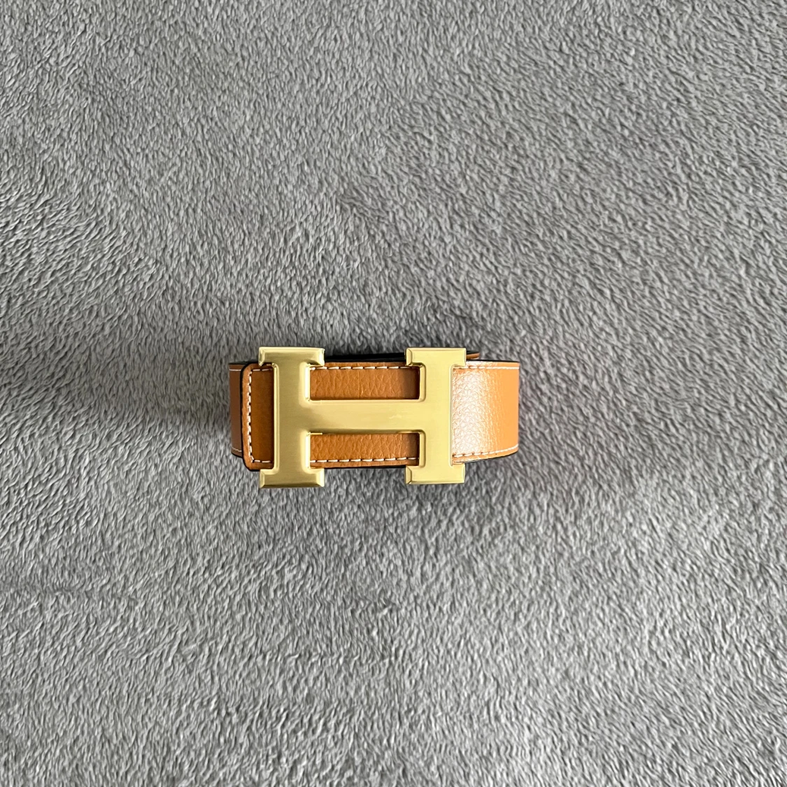 Snyggt Hermès-bälte i brunt och svart skinn med ikoniskt H-spänne i guld. Bältet är vändbart med en sida i ljusbrunt och en i svart, vilket gör det superenkelt att matcha till olika outfits. Klassisk design med exklusiv känsla och tydliga sömmar längs kanterna.
