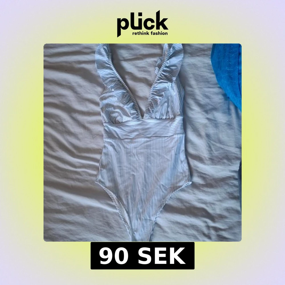 Supersöt baddräkt från H&M i vitt och ljusblått med smala ränder. Djup v-ringning och volangdetaljer längs axelbanden. Tillverkad i stretchigt material. Använd en gång(provat)