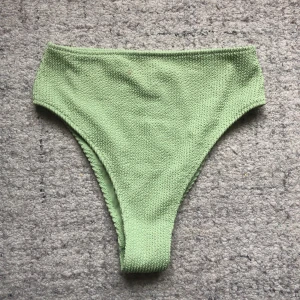 Grön ribbad bikiniunderdel i en high waist modell från hm. Använd ett fåtal gånger, har några små missfärgningar, därav priset 🌼