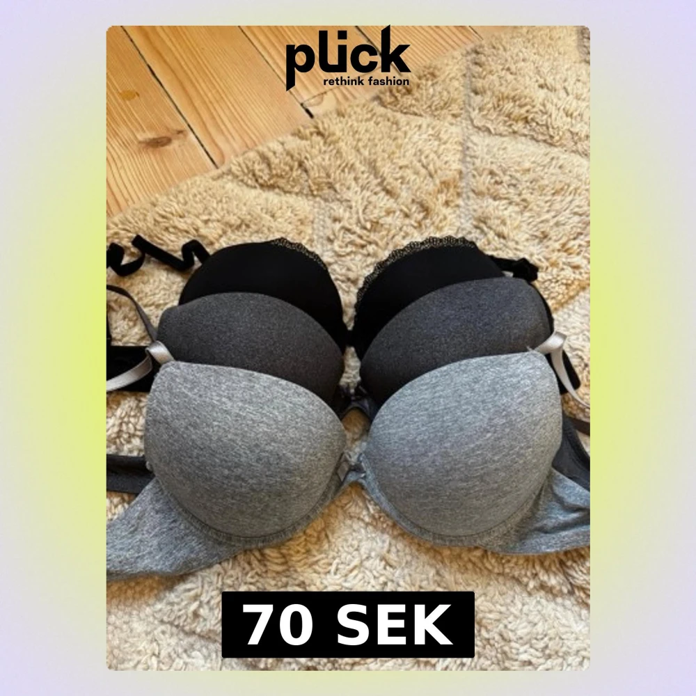 3 bh:ar i olika nyanser av grått och svart. Alla har vadderade kupor och justerbara axelband. Perfekt basplagg för garderoben. Aldrig använda. 2 st 80B, 1st 75B