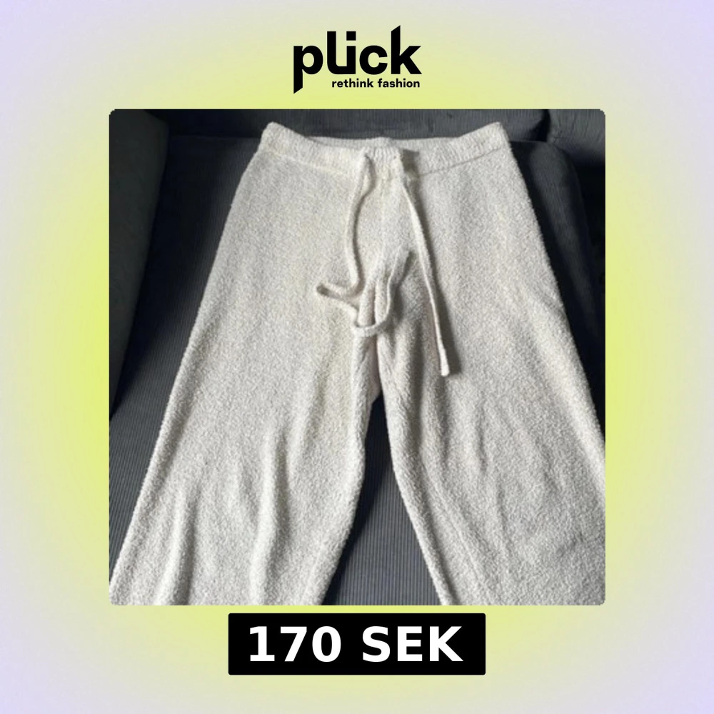 Supermysiga vita mjukisbyxor i frottéliknande material med dragsko i midjan. Perfekta för chill dagar hemma och har en loose fit för extra komfort. Matcha gärna med en crop top för en avslappnad look. byxorna är i storlek L och linnet storlek M