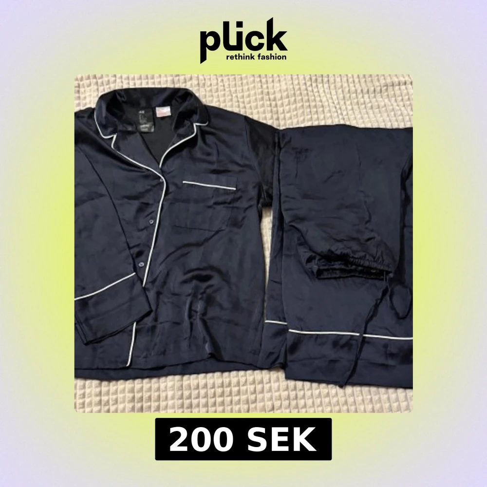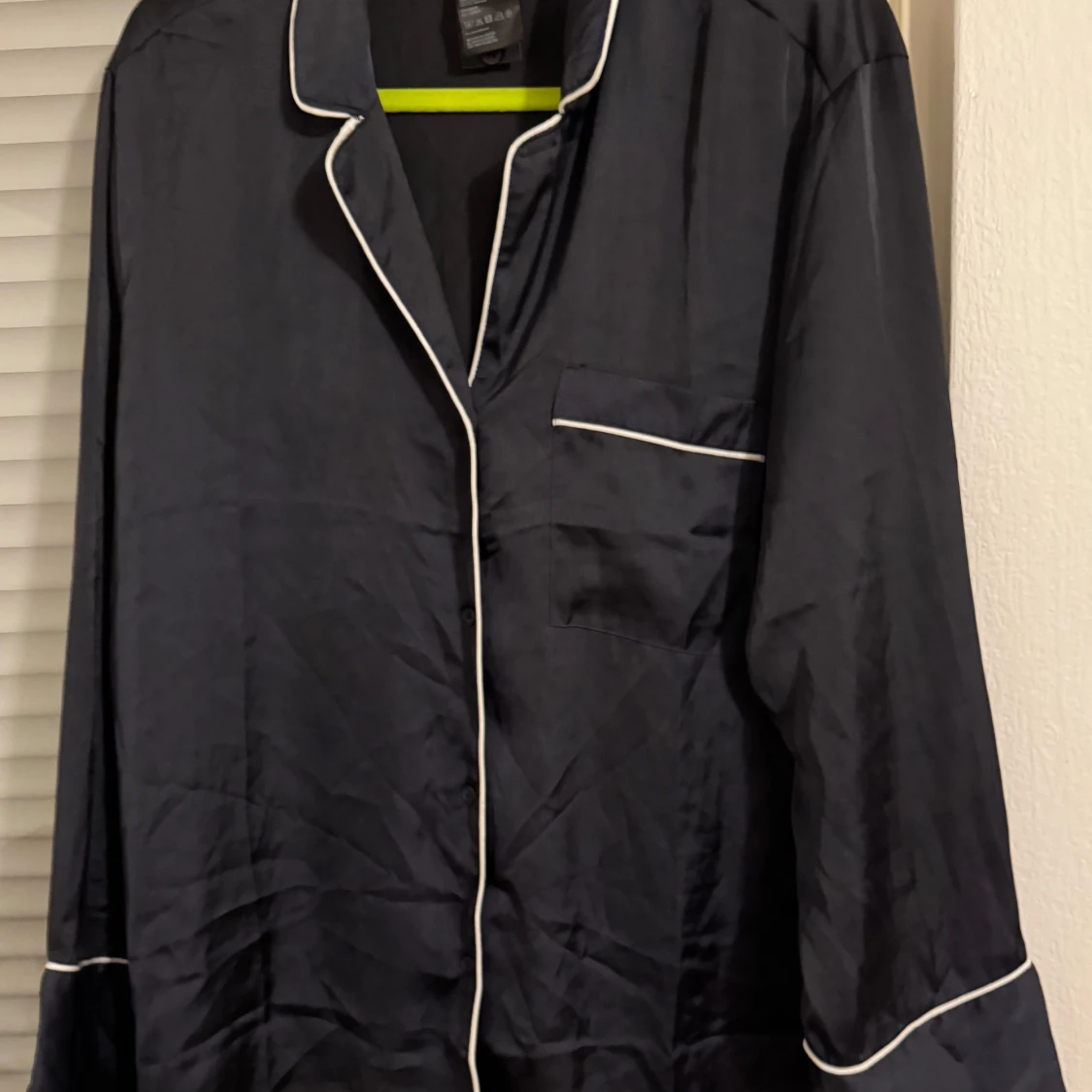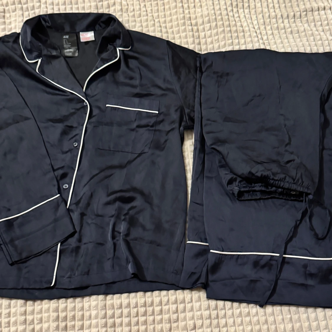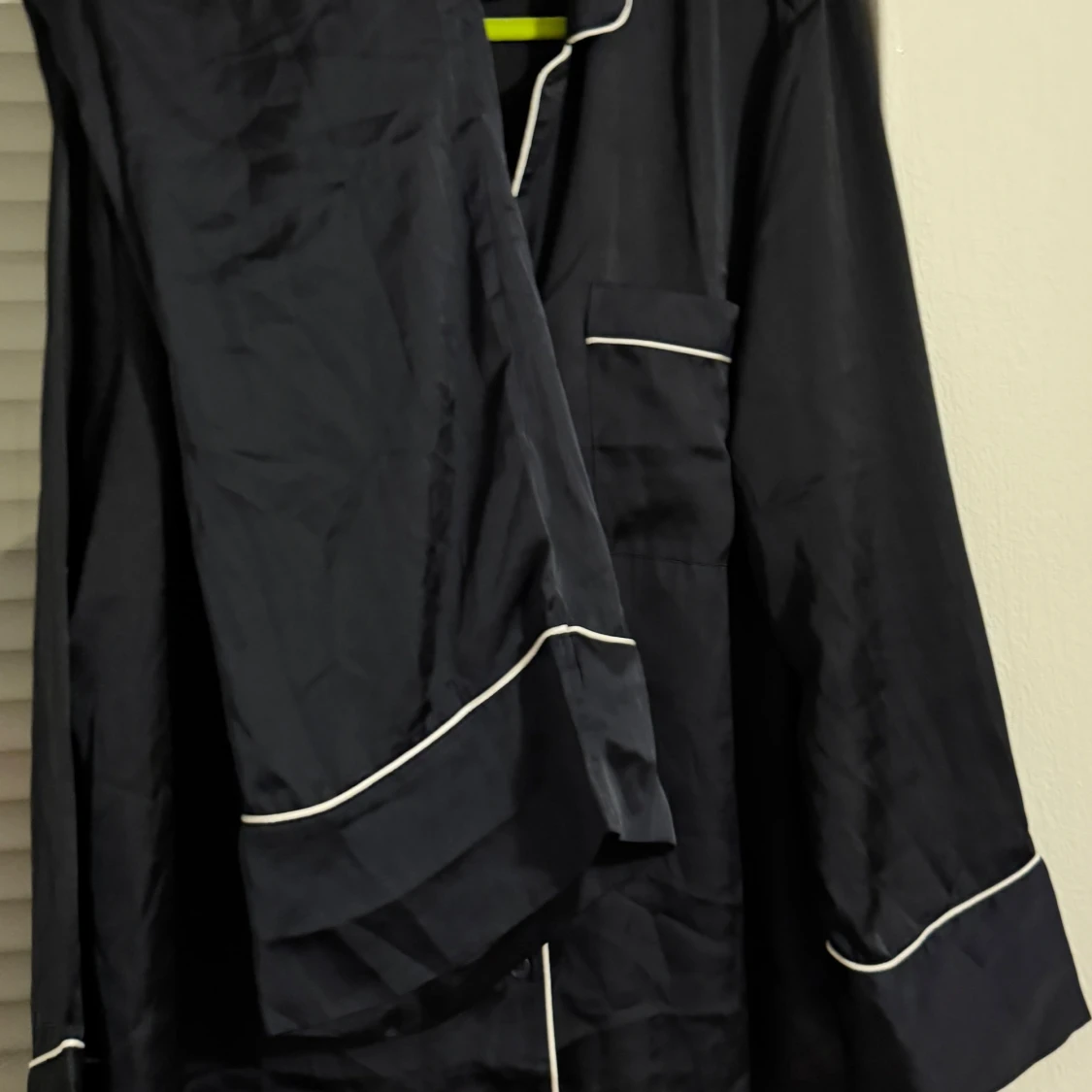 Två fina siden pyjamas delar skjorta och byxor. Marinblå med vackra vita detaljer. Om ni vill se den på, skriv gärna!