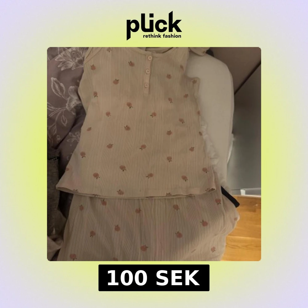 Supersöt pyjamas från H&M med små persikofärgade frukter och tunna ränder. Tröjan är ärmlös, har knappar framtill och är gjord i mjuk bomull. Perfekt för varma dagar när du vill känna dig både chill och söt.