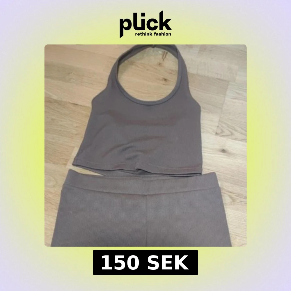 Säljer en brun croppad linnetopp med ribbad struktur. Toppen har ärmlös design och rund halsringning, perfekt för en avslappnad stil. Bruna shorts tillkommer även. Storlek