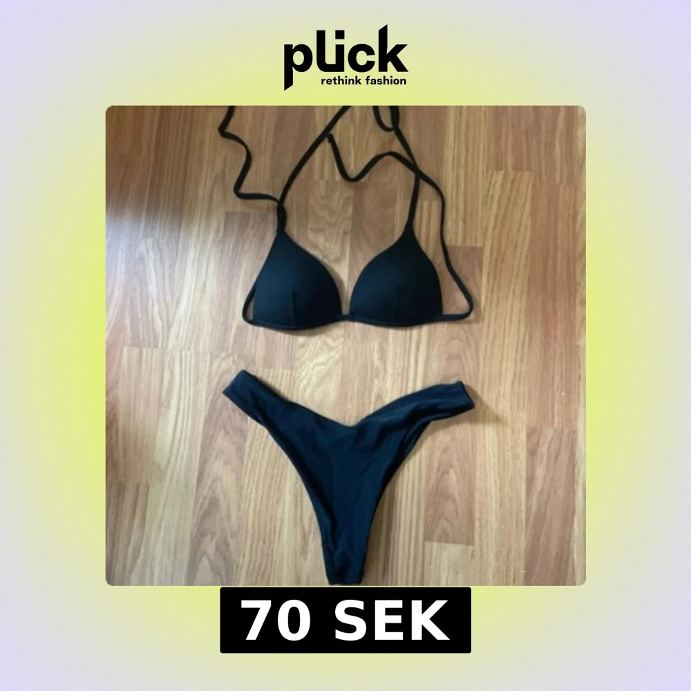 Stilren svart bikini från shein, toppen är i xs och trosorna i s! Triangelformad överdel med knyt i nacken och ryggen, samt vadderade kupor. Matchande trosa med hög benskärning. Perfekt för stranden eller poolen, enkel och klassisk design.