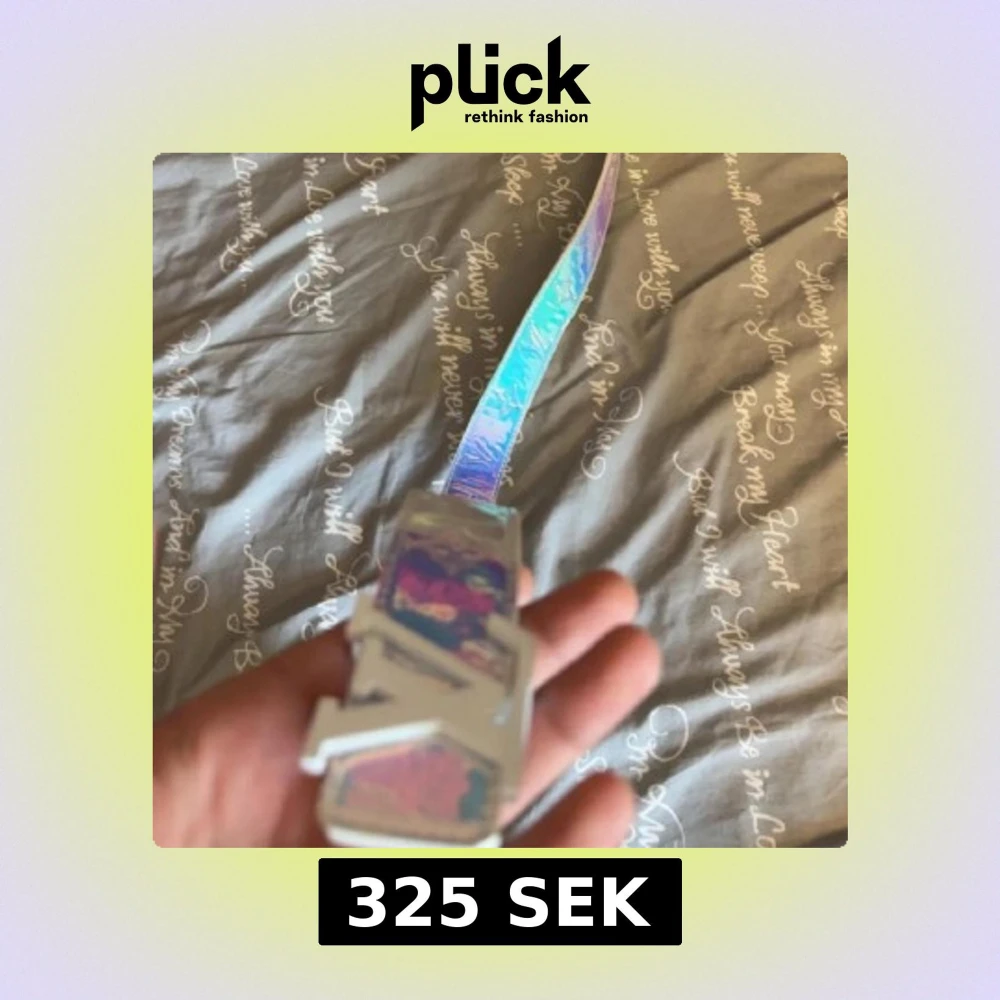 Säljer ett coolt holografiskt bälte med stora silverdetaljer och spänne. Bältet har en skimrande yta i regnbågsfärger och är perfekt för att ge outfiten en unik touch.