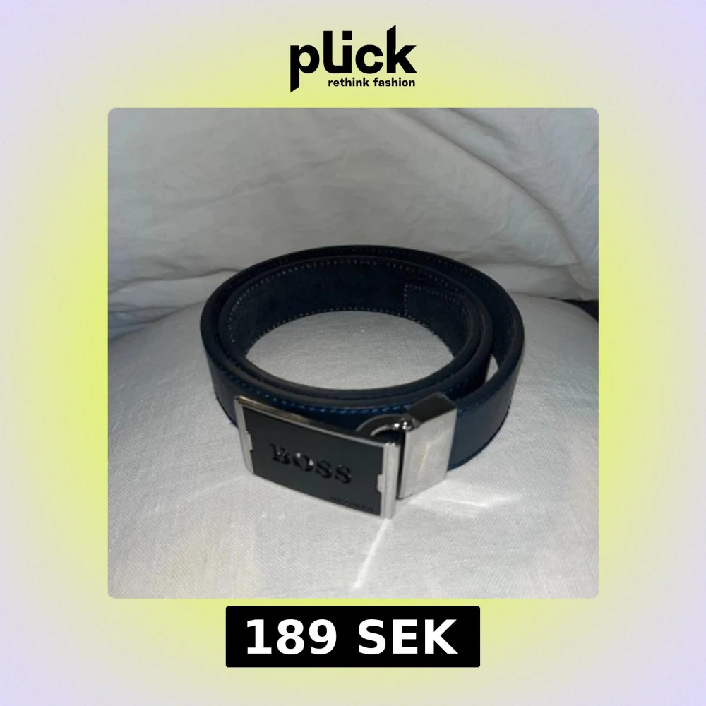 Snyggt svart skärp från Hugo Boss i skinn med stilren, rektangulär metallspänne där det står BOSS. Bältet har en klassisk design med diskreta blå sömmar och passar perfekt till jeans eller kostymbyxor. Metallspännet har en modern känsla och ger ett exklusivt intryck.