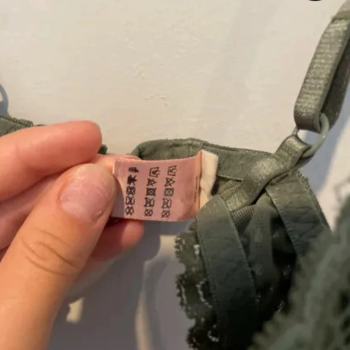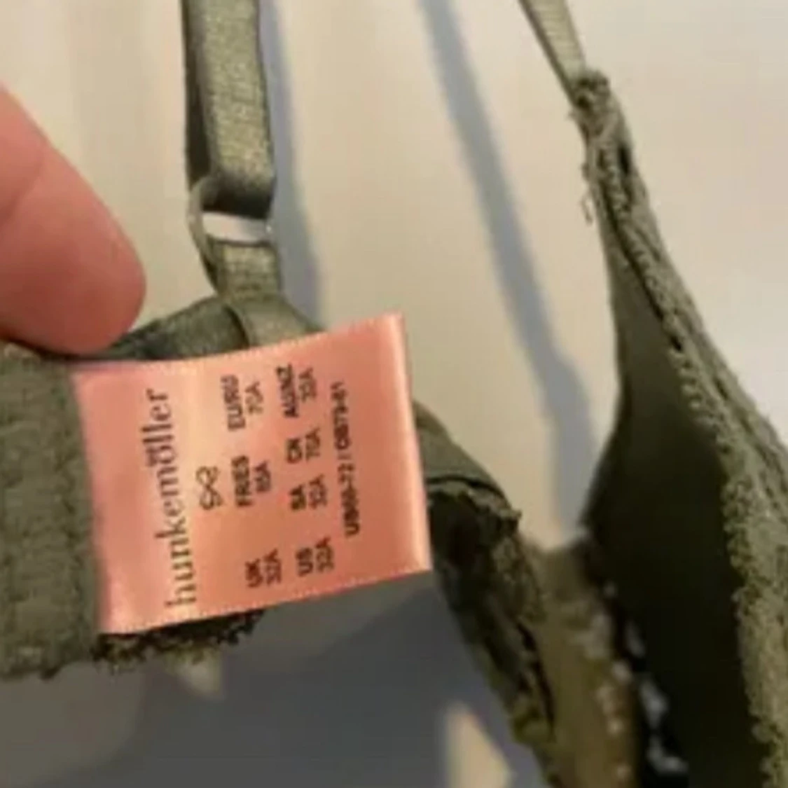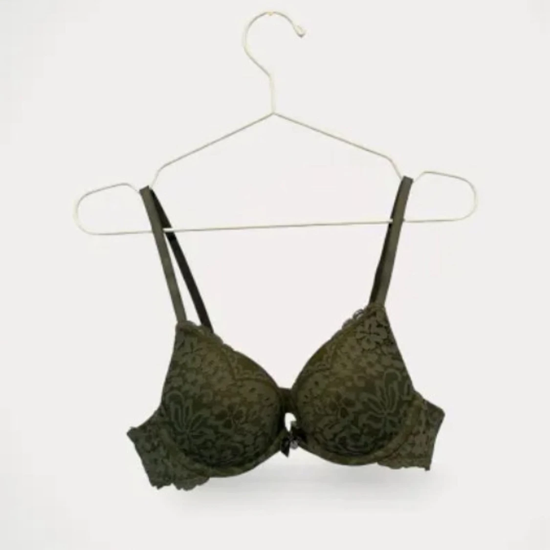 Supersnygg olivgrön bh från Hunkemöller med spetsdetaljer och liten rosett framtill. Bh:n har vadderade kupor och justerbara axelband för perfekt passform.