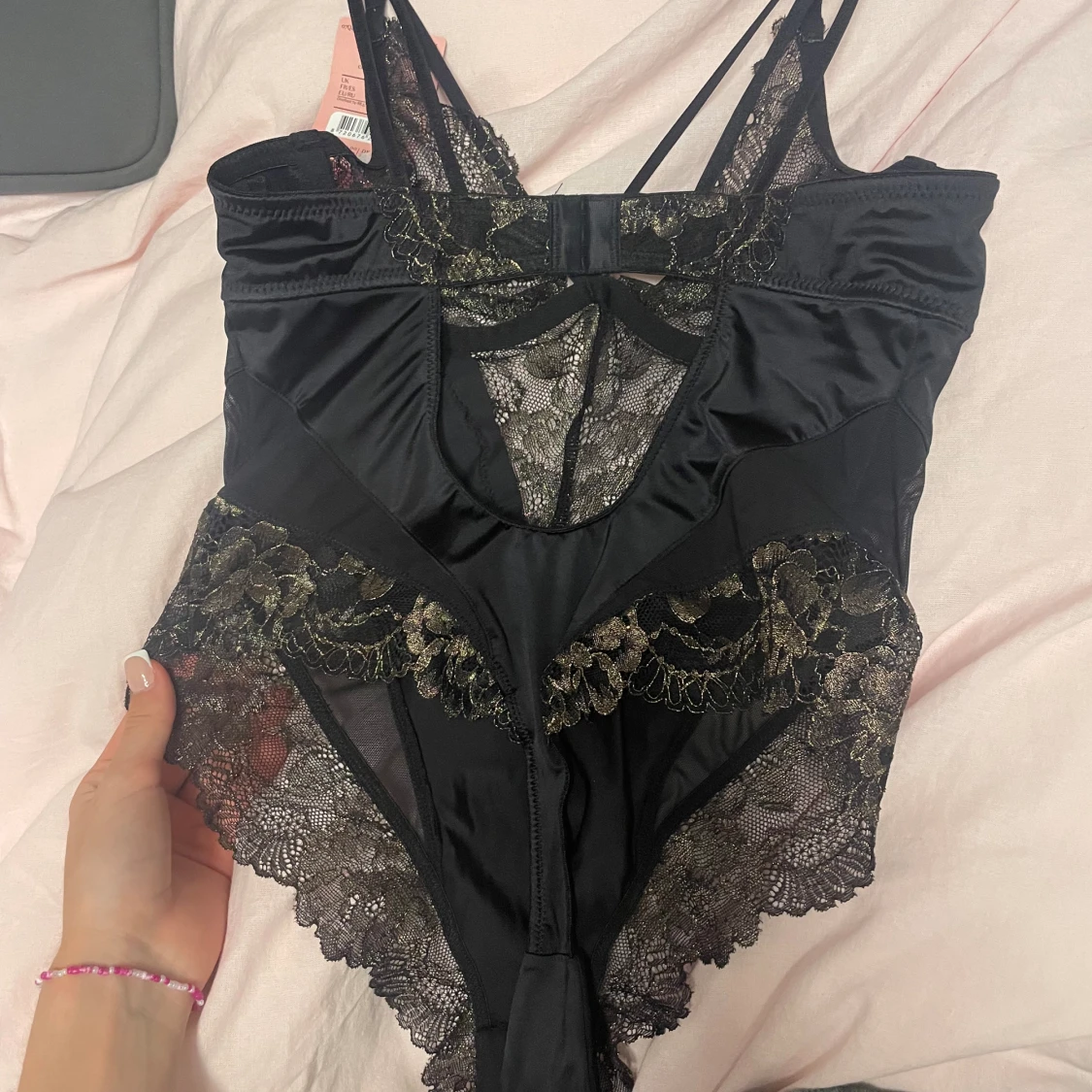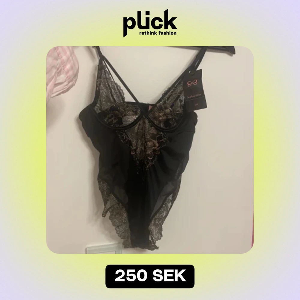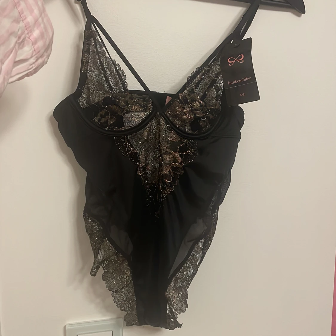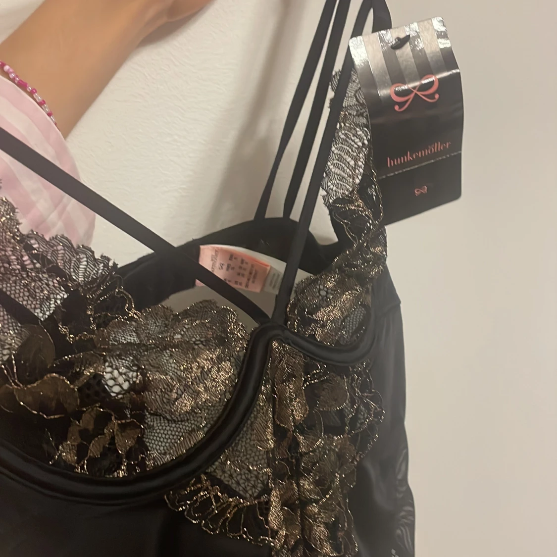 Helt helt ny med prislapp kvar (se sista bild) så självklart aldrig använd. Strl XS Väldigt mörk mörk blå med guldiga/champange spets Från Hunkemöller