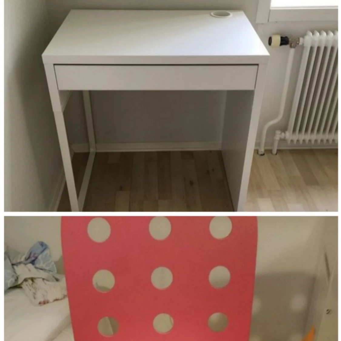 Säljer en vit skrivbord med en rosa skrivbirdsstol.