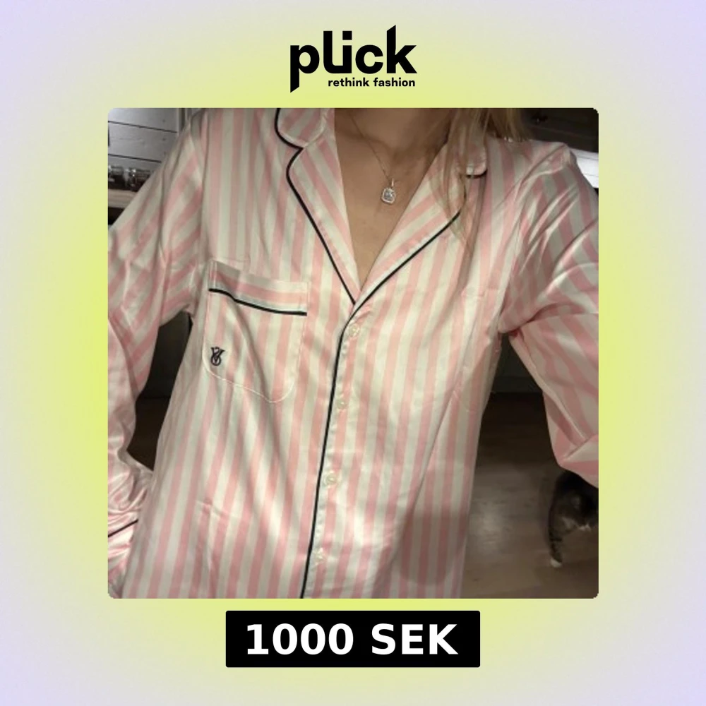 Helt ny snygg pyjamas från Victoria's Secret i satin material med rosa och vita ränder. Klassisk krage, svarta kontrastkanter och bröstficka med VS-logga. Perfekt för dig som gillar en söt och lyxig look. både byxor och skjorta. Kommer i originalpåse