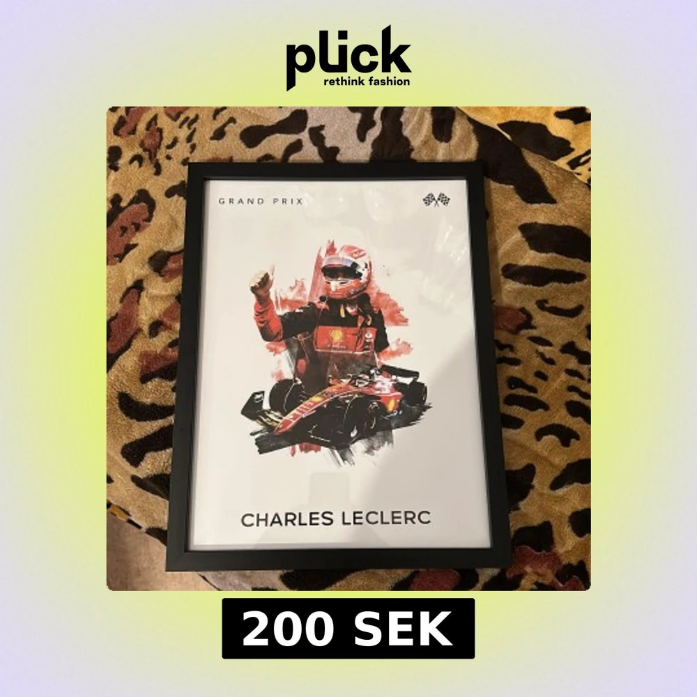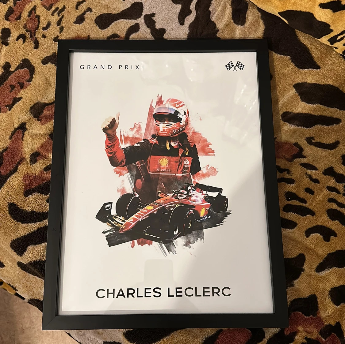 Snygg inramad affisch med motiv av Charles Leclerc i racingutrustning och bil. Perfekt för motorsportentusiaster och fans av Grand Prix. Affischen har en stilren design med svart ram.