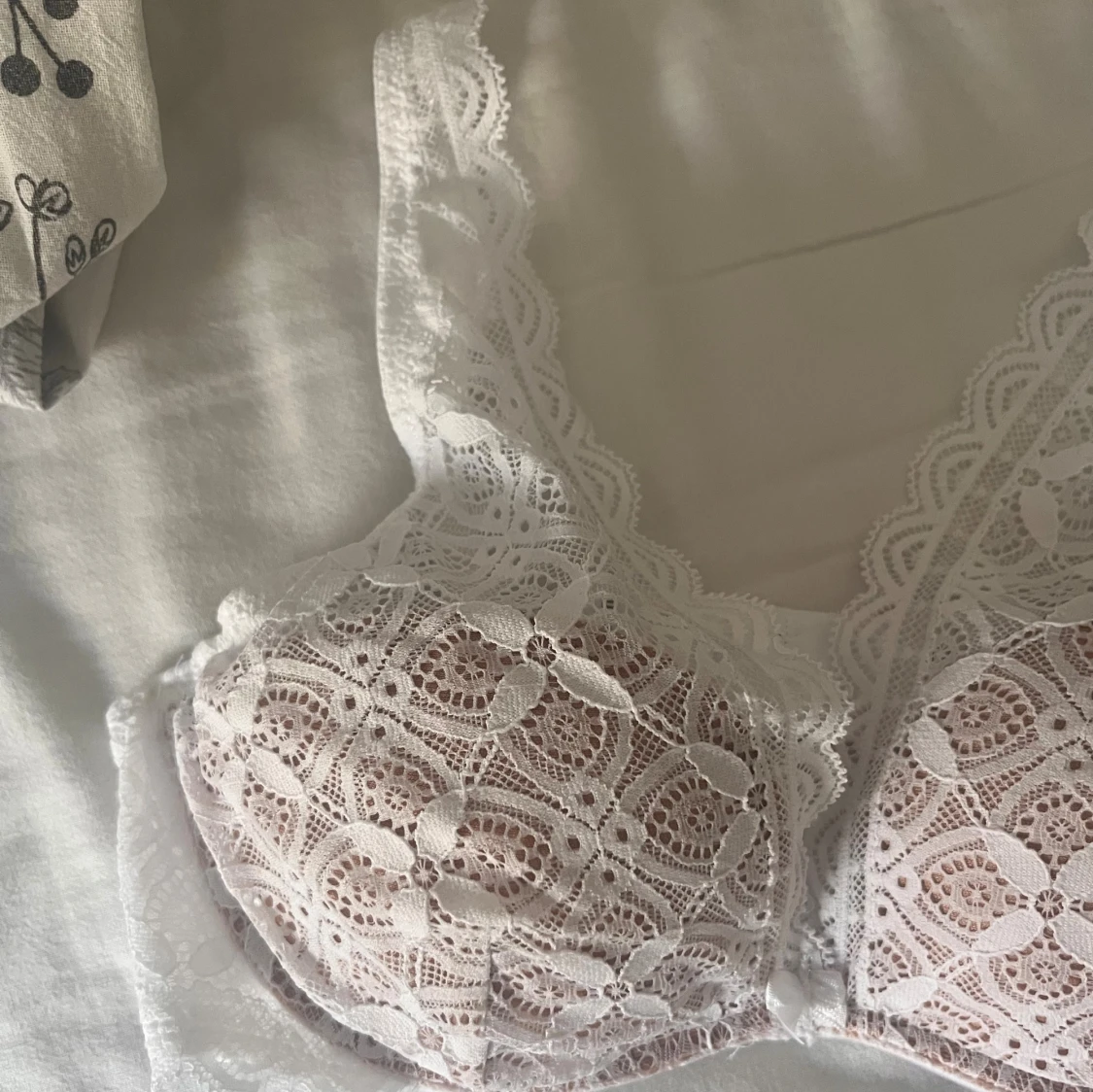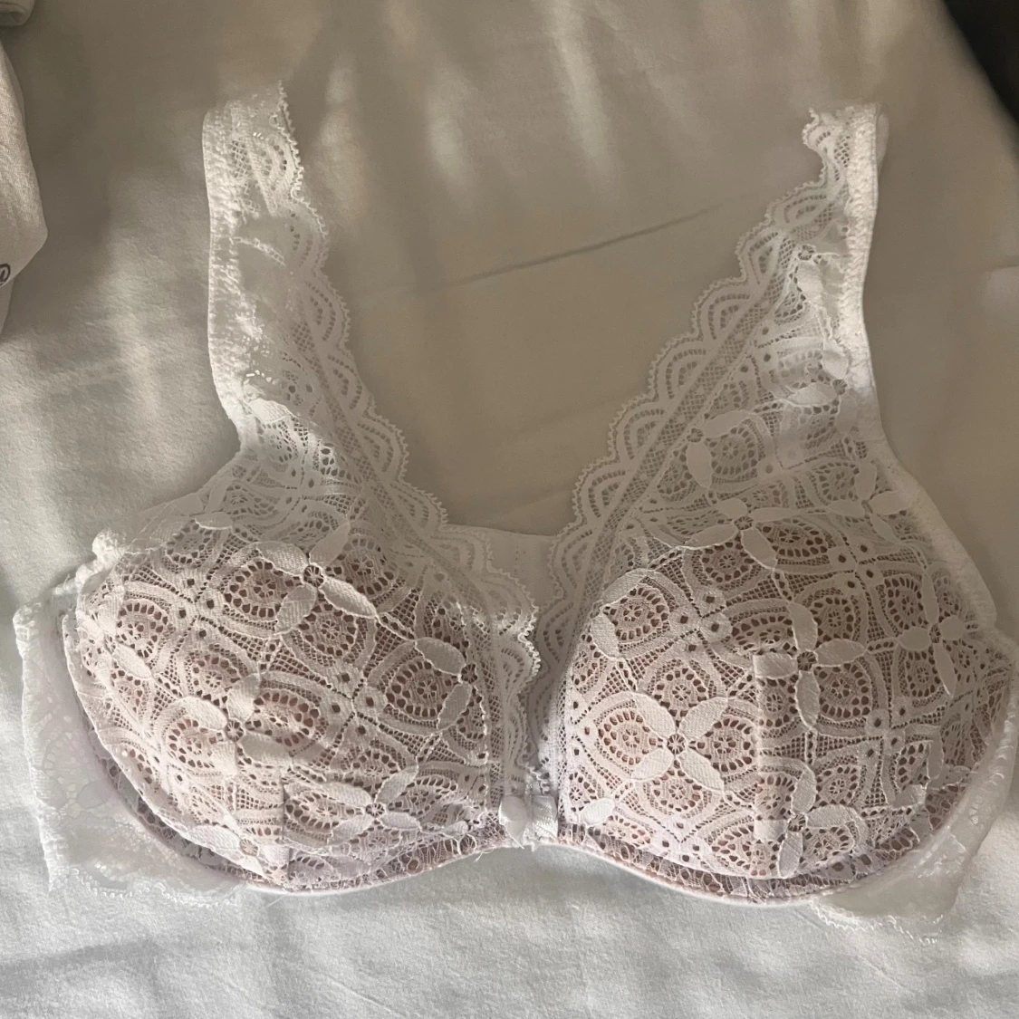 Supersnygg vit bh från Intimissimi med genombruten spets och blommigt mönster. Aldrig använd. 🫶🏻😊