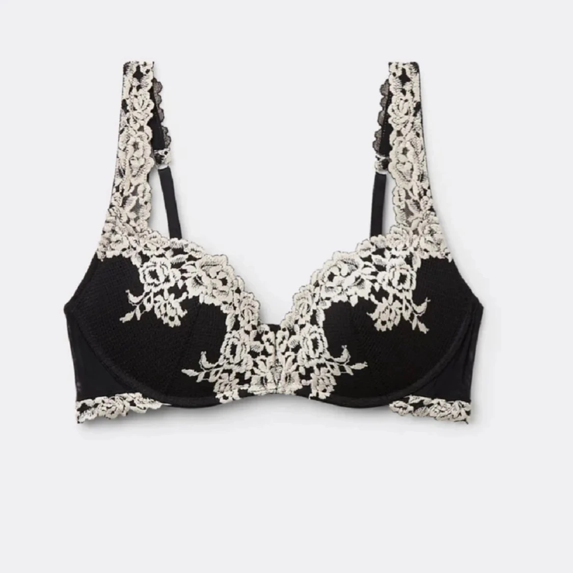 Snygg svart bh med vit blommig spets och broderade detaljer längs kupor och axelband. Ger en lyxig och feminin känsla med sina kontrasterande färger och eleganta spetsmönster. Perfekt för dig som gillar stilrena och romantiska underkläder.