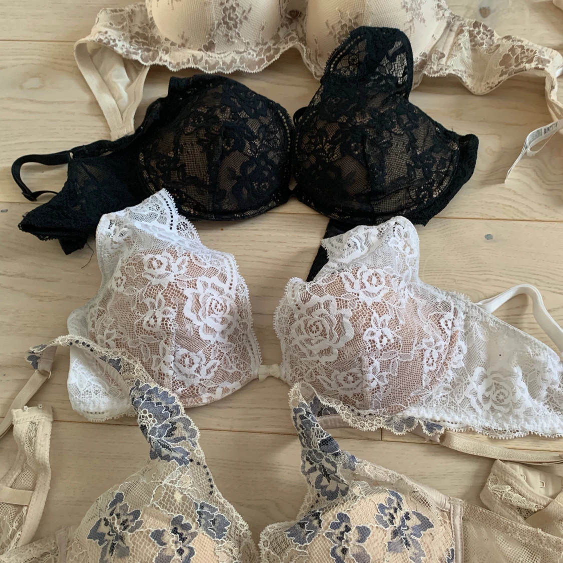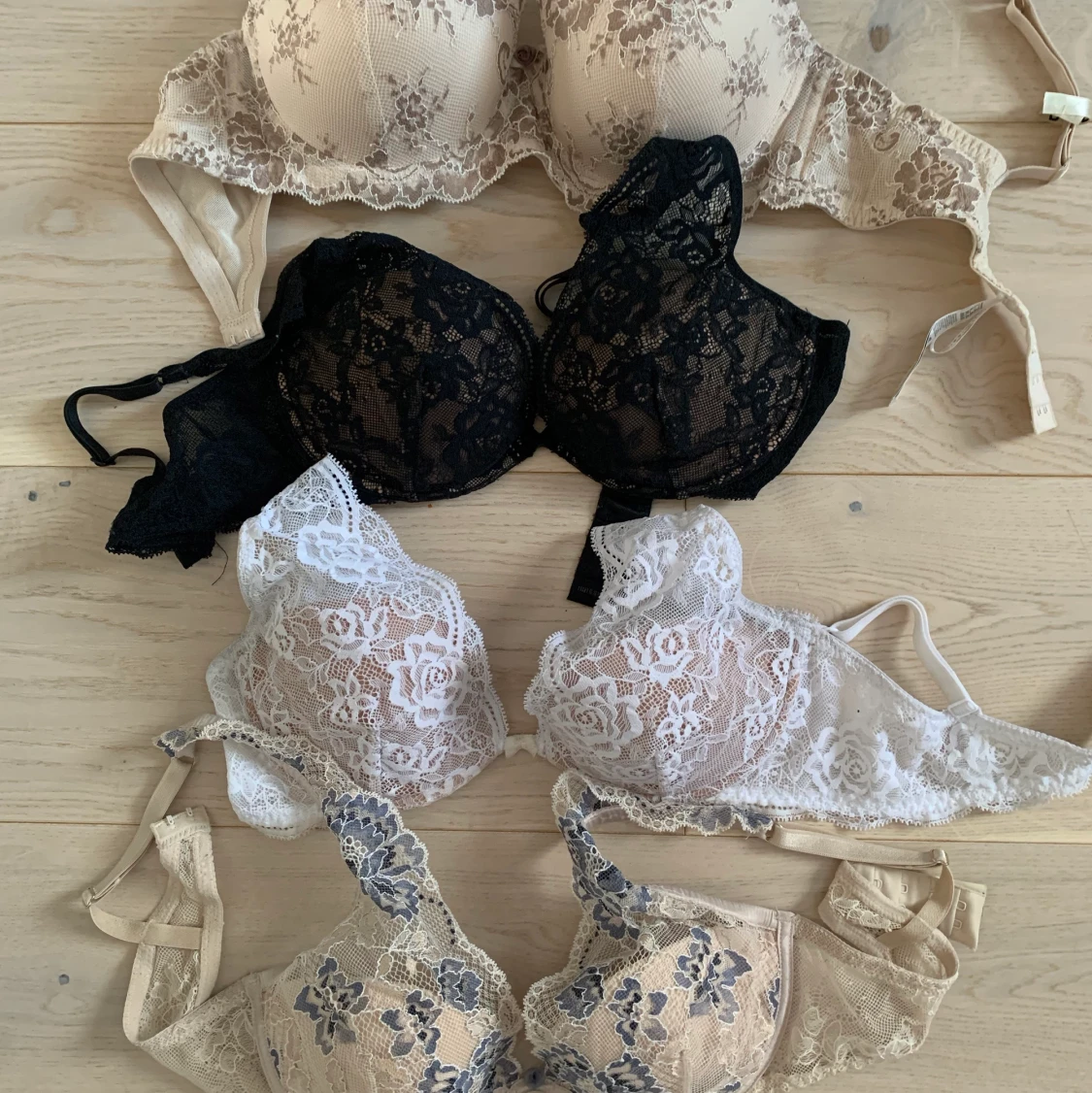 Bh:n längst upp är aldrig använd storlek 80D och dom tre resterande är storlek 75C, använda ett fåtal gånger men säljer då dom tyvärr är för små. 120kr styck! Köpta för mycket mer