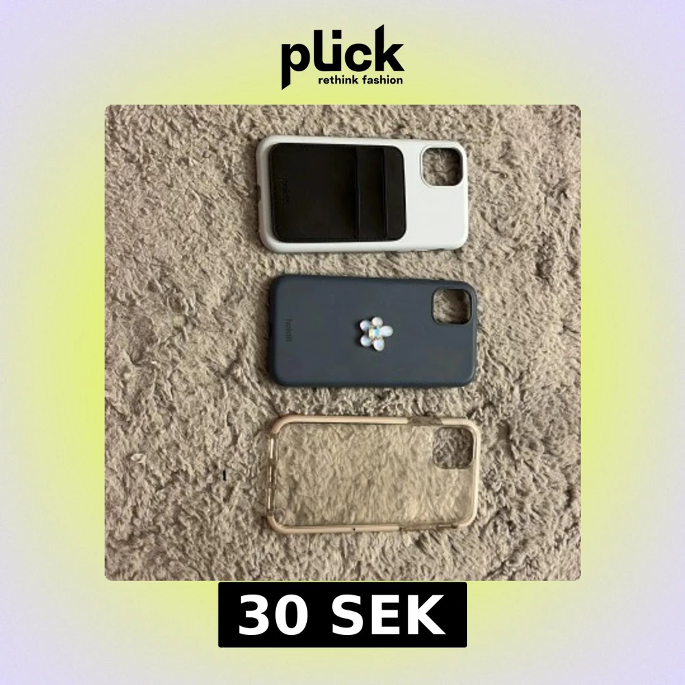 Säljer tre olika mobilskal från Holdit. Ett vitt skal med svart kortfack, ett mörkgrått skal med en glittrig blomma och ett genomskinligt skal med beige kant. Passar perfekt till dig som vill variera stilen på din mobil!