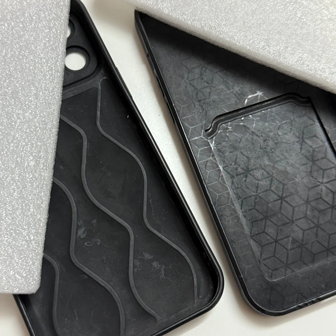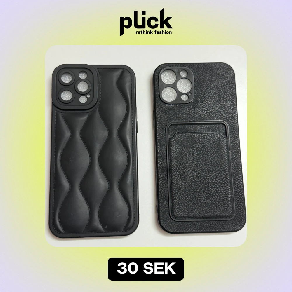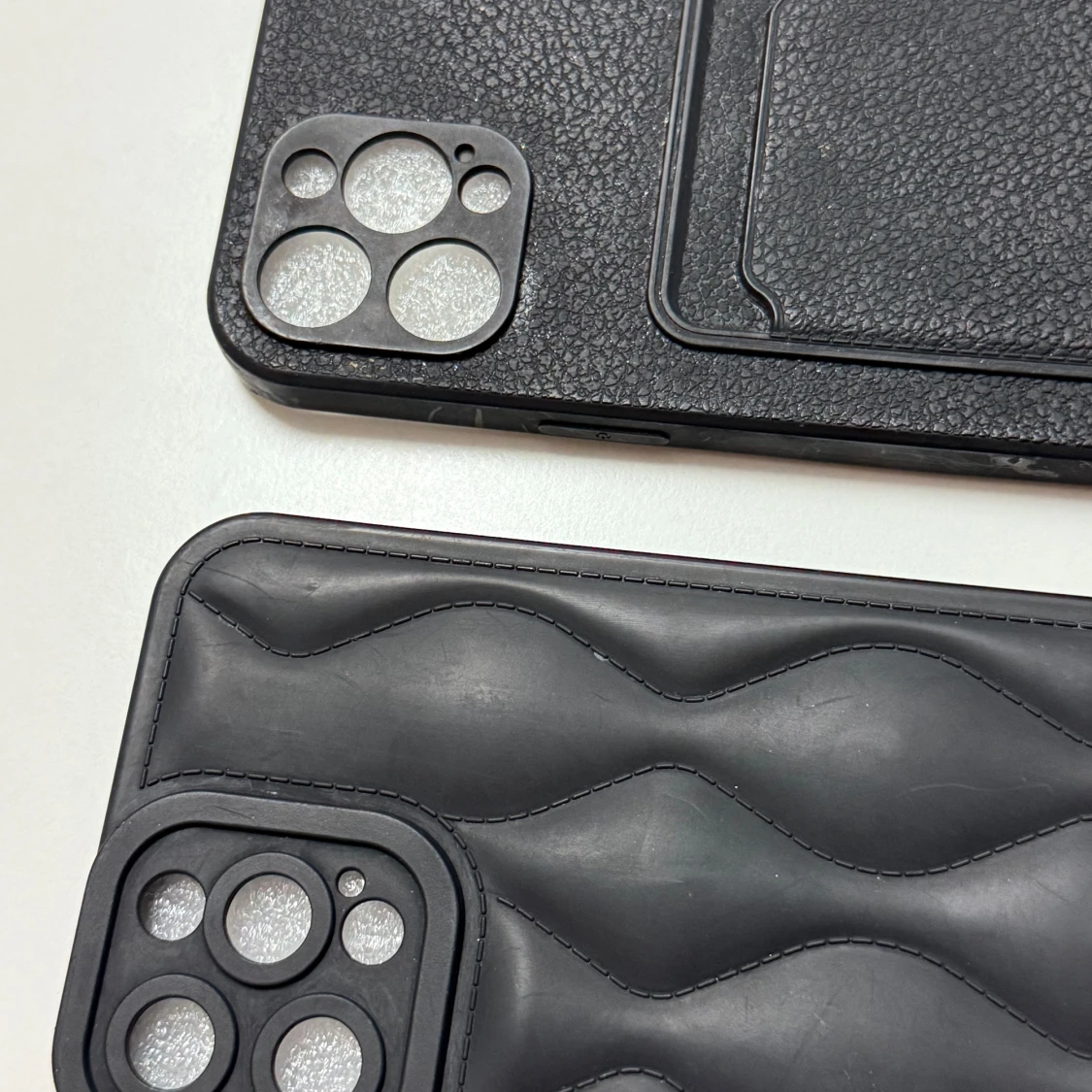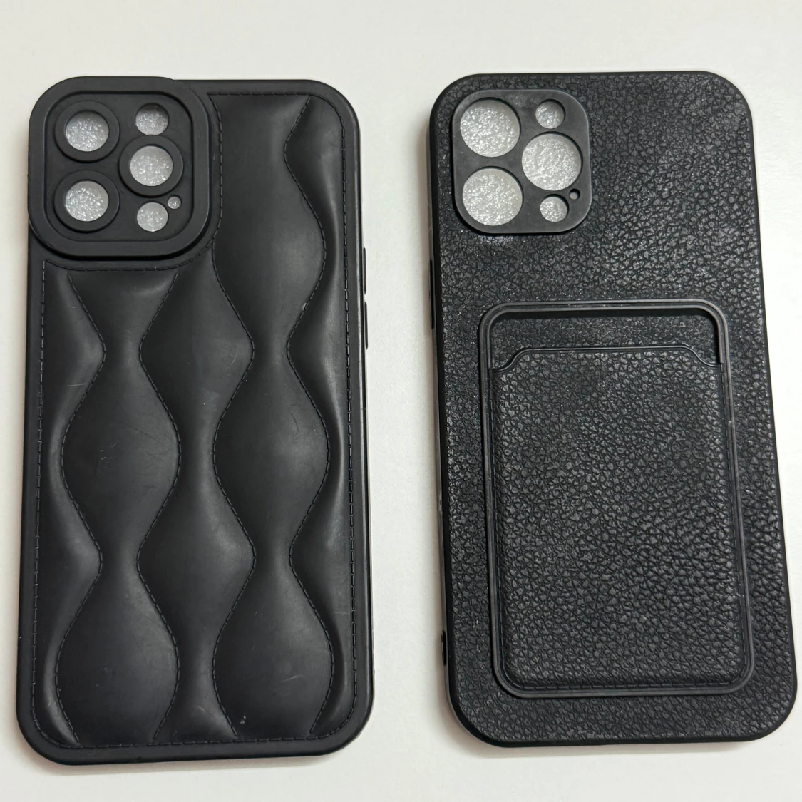 Två stiliga svarta mobilskal med olika texturer. Ett har en vågig quiltad design medan det andra har en slät yta med ett kortfack. Perfekt för att skydda din telefon med stil! Passar för iPhone 12 PRO Max.