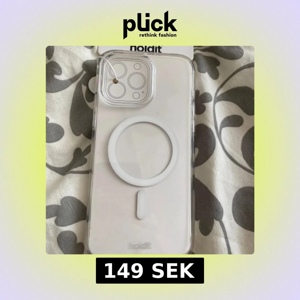 Säljer ett transparent MagSafe-kompatibelt mobilskal från Holdit till iPhone 15 Pro Max. Skalets design är stilren med en vit cirkel på baksidan för MagSafe-funktion. Tillverkat i tålig plast som skyddar mobilen utan att dölja dess färg.