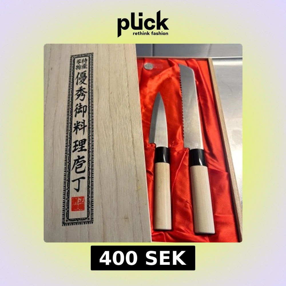 Säljer ett exklusivt japanskt knivset med två knivar i olika storlekar, levereras i en elegant trälåda med röd satininredning. Handtagen är ljusa och knivarna har klassisk japansk design, varav en har tandad egg.