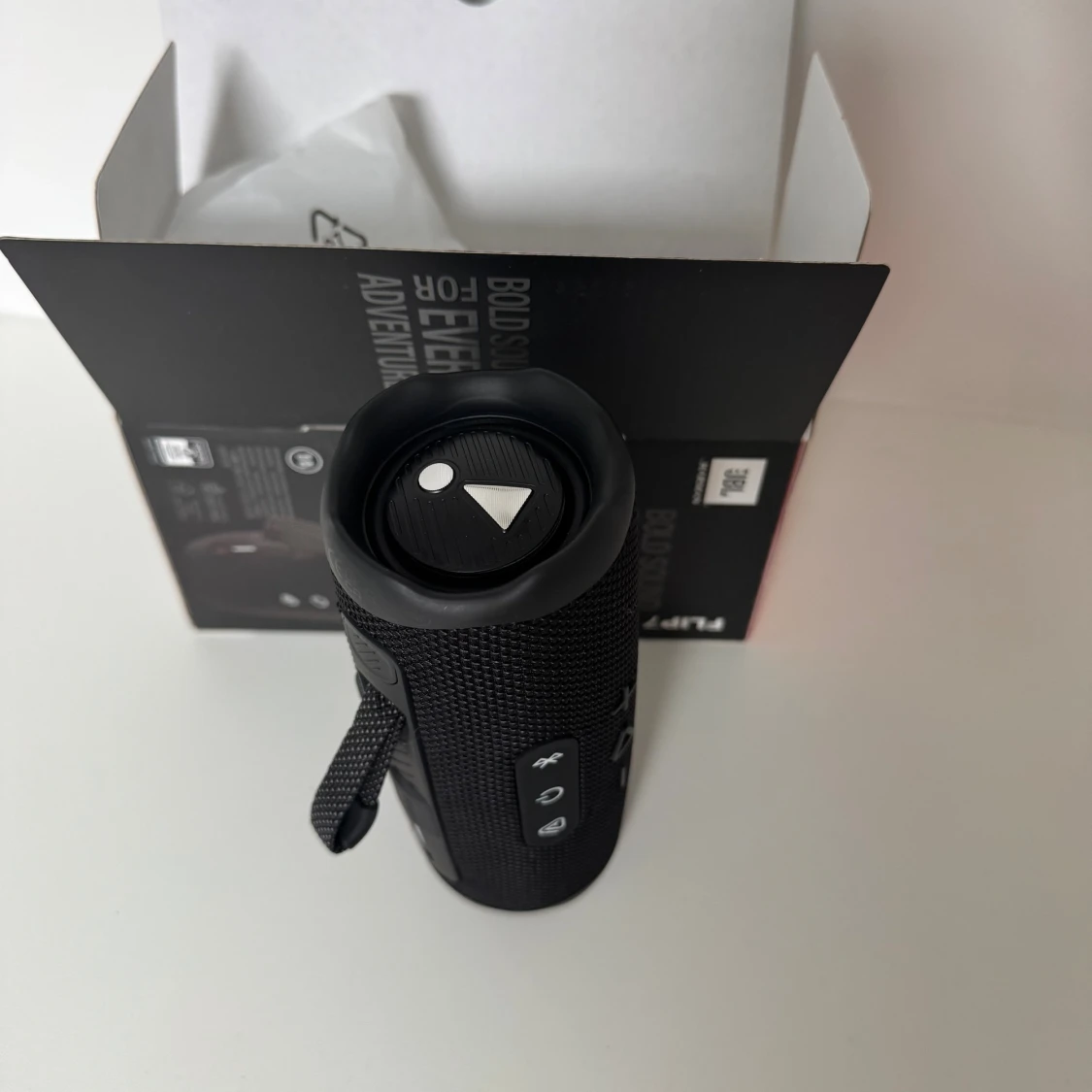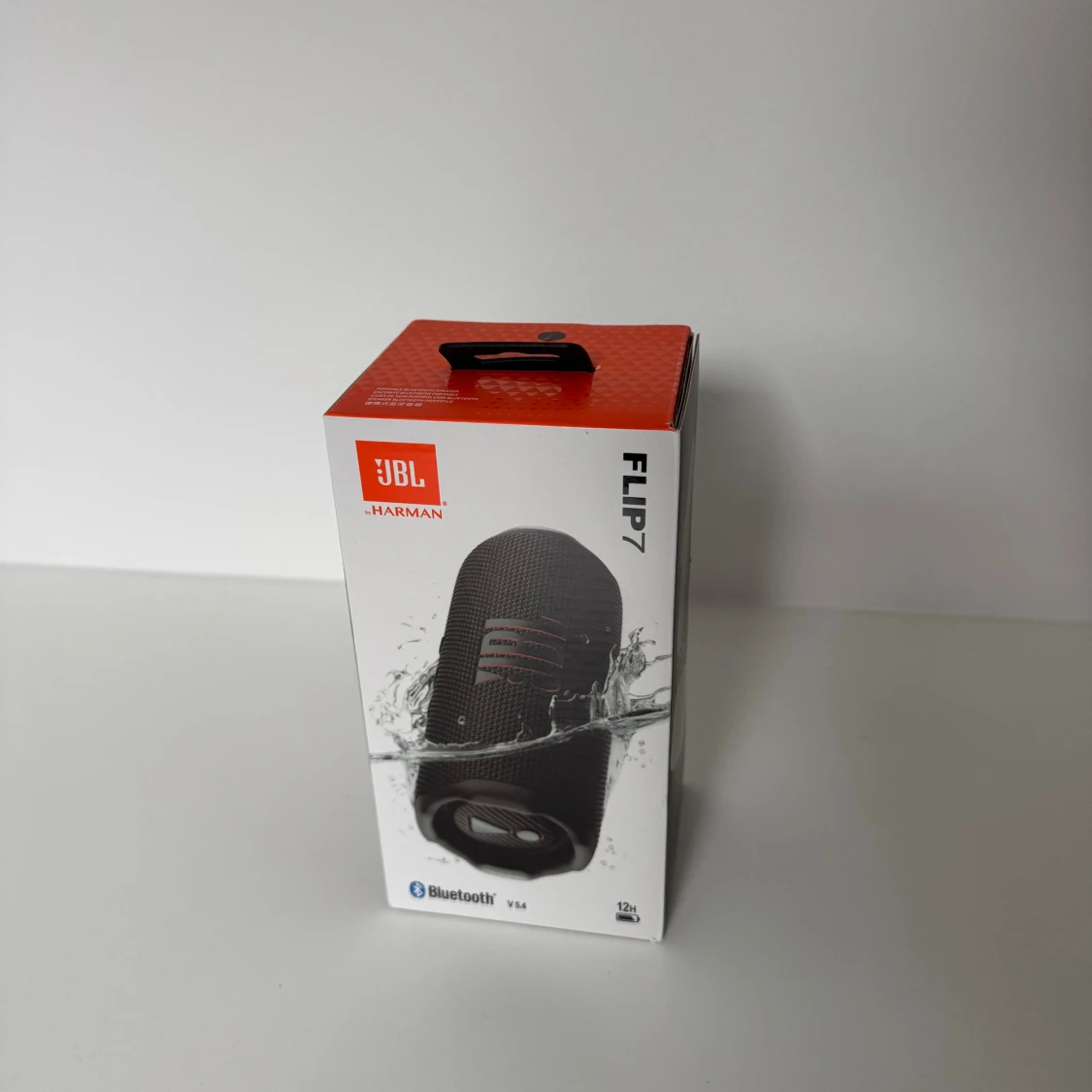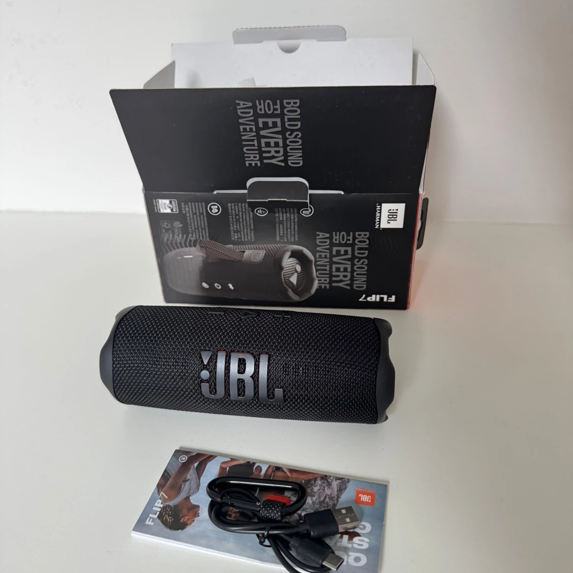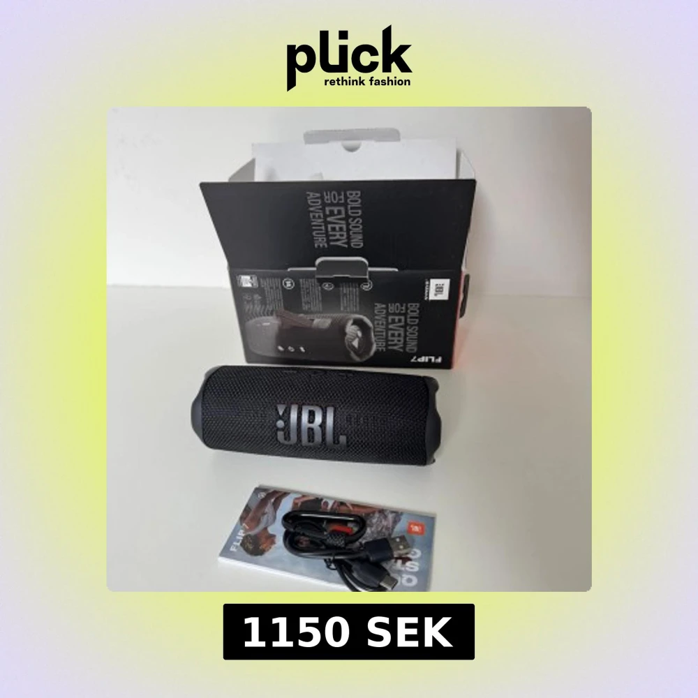 JBL Flip 7 bärbar Bluetooth-högtalare med kraftfullt ljud, vattentät design och upp till 12 timmars batteritid. Produkten är i nyskick med originalkartong, USB-kabel och manual. Perfekt för både inomhus och utomhusbruk, inga synliga defekter eller slitage.
