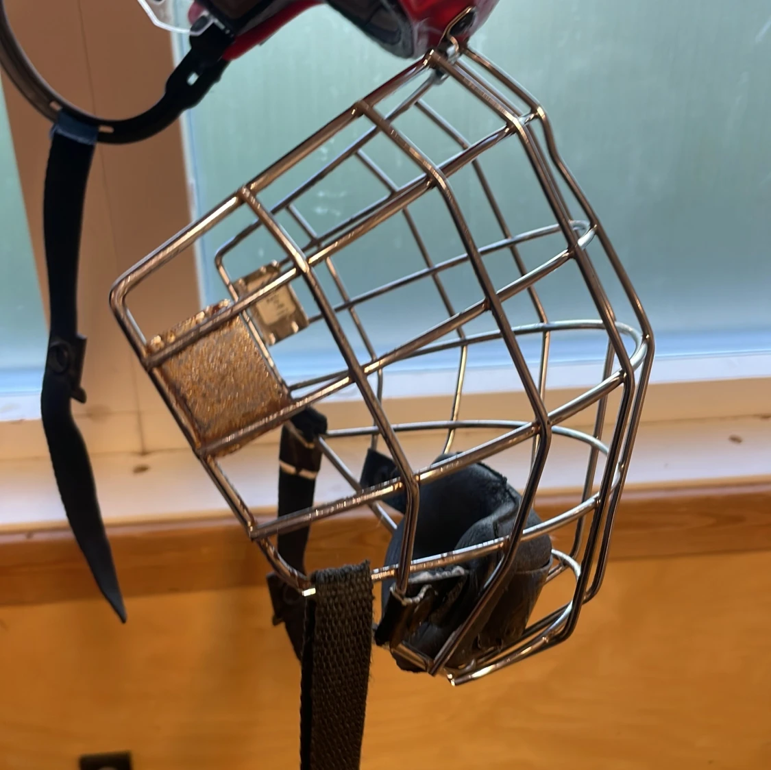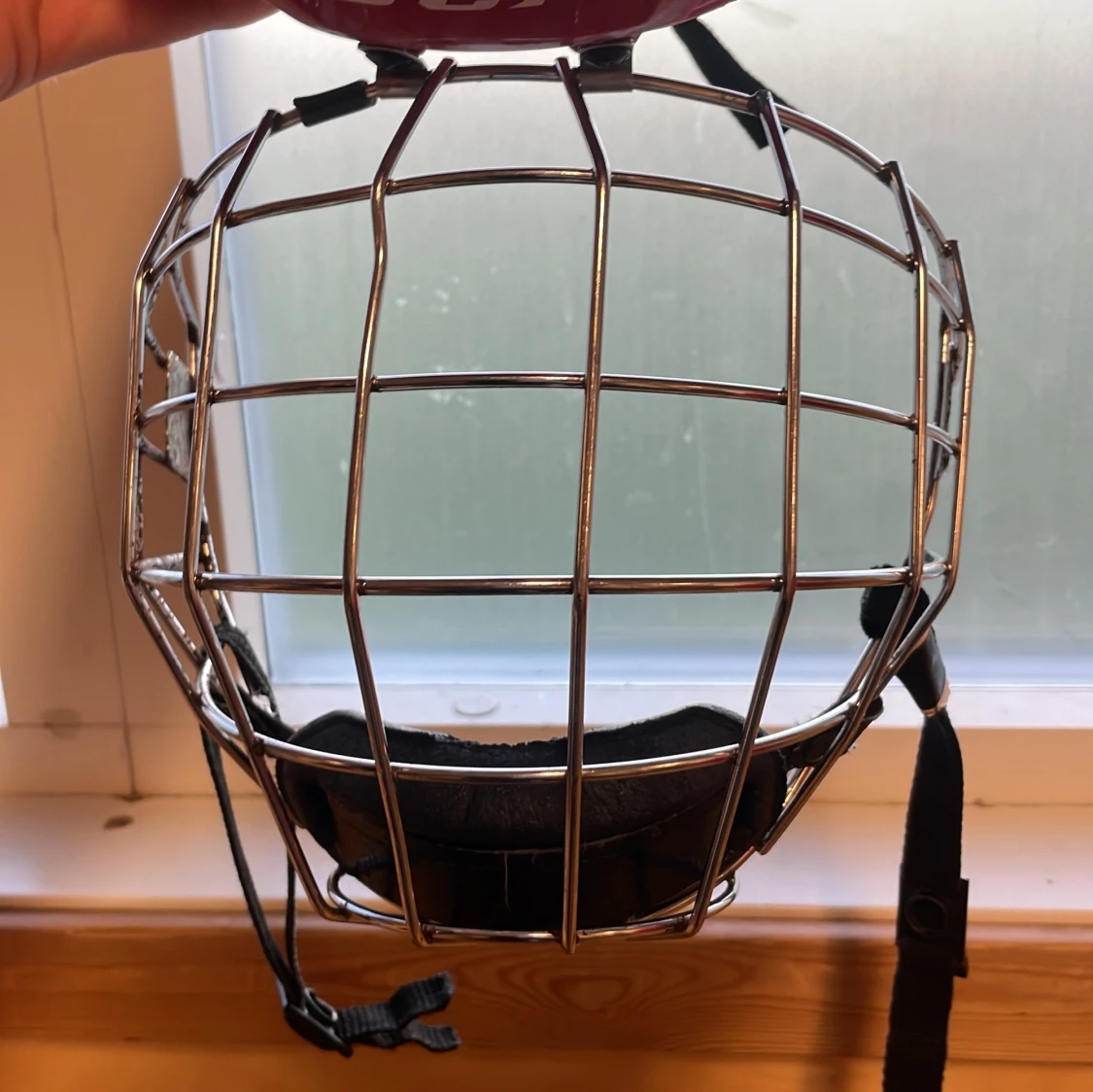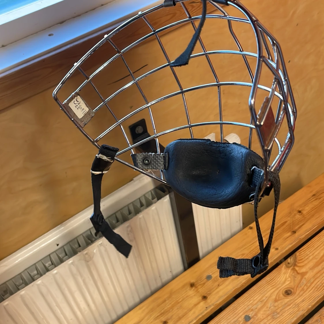 Säljer ett Jofa 480M hockeygaller i silverfärgad metall med svart hakskydd och justerbara remmar. Gallret är sällsynt och passar perfekt till hockeyhjälm för extra ansiktsskydd på isen.🏒 Gallret passar troligtvis S på hjälmen! Gallret är lite rostigt men den är sällsynt och tillverkas inte längre!