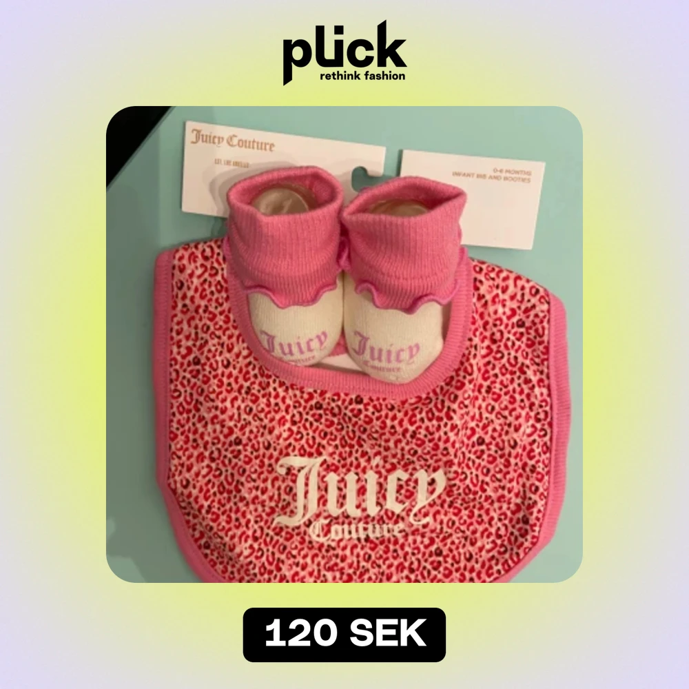 Supersöta rosa och vita babysockor från Juicy Couture. Perfekta för de minsta, med mjukt material och stilren design. Sockorna har en söt rosa kant och vit bas med 'Juicy' tryckt på. Passar perfekt ihop med den matchande haklappen i leopardmönster.
