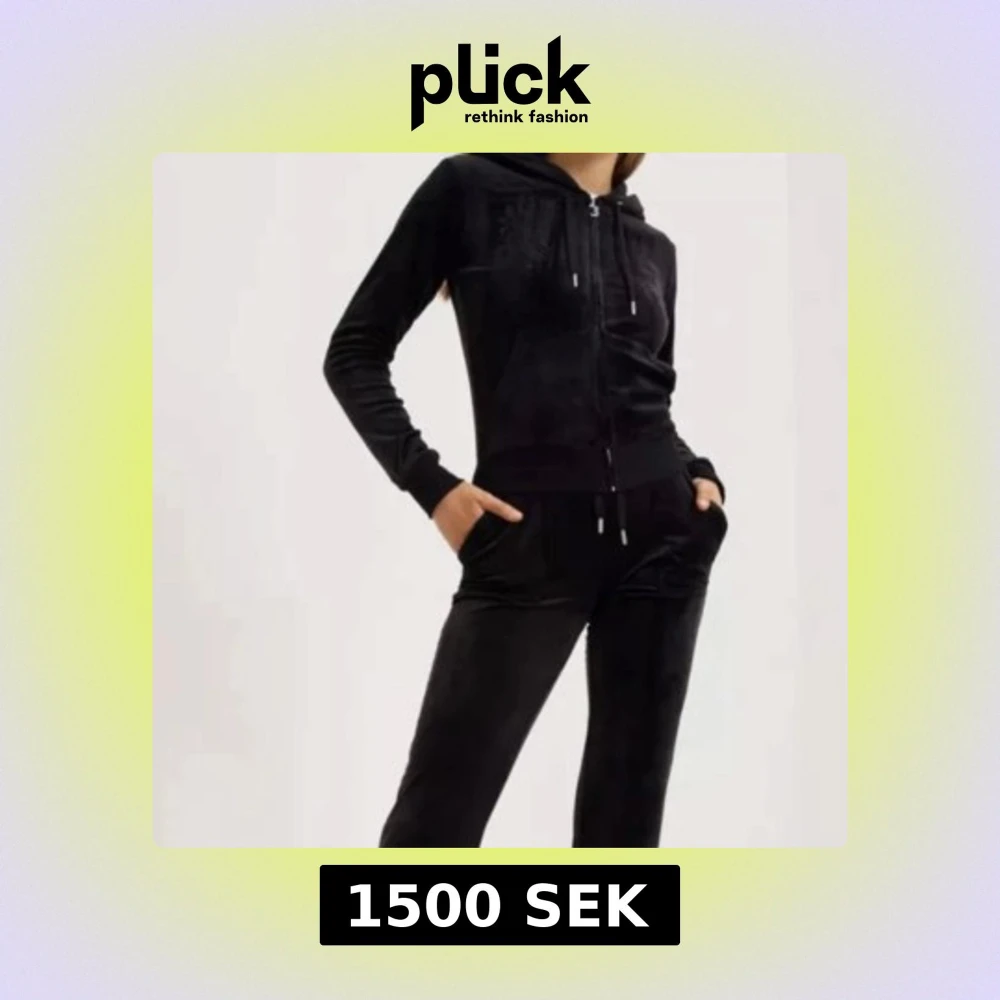 Snygg och bekväm svart hoodie i mjukt sammetstyg. Den har en dragkedja framtill och justerbara snören i huvan. Perfekt för en avslappnad stil. Byxor följer med hel set från juicy coutoure