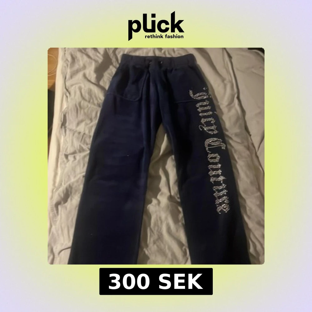 Mörkblå mjukisset i velour från Juicy Couture med stora strasstenar som bildar loggan längs ena benet samt på ryggen av koftan. Byxorna har normal passform, hög midja och fickor både fram och bak. Koftan har fickor och luva. Perfekta för en avslappnad och trendig look.