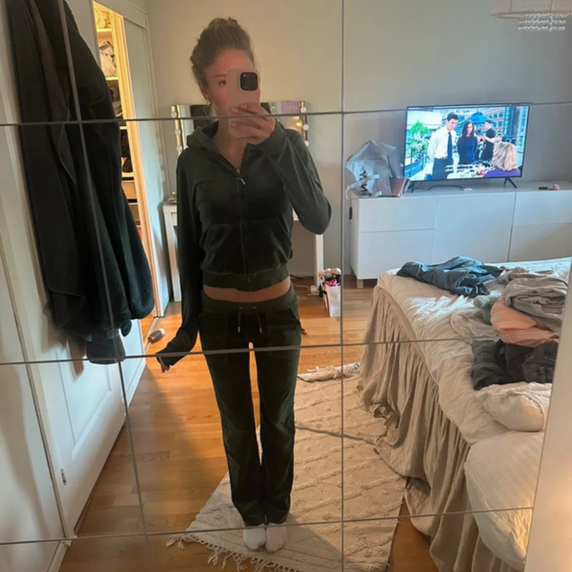 Säljer ett mörkgrönt juicy sett i oanvänt skick!! Strl xs i tröjan och xxs i byxan, jag är 172!❤️