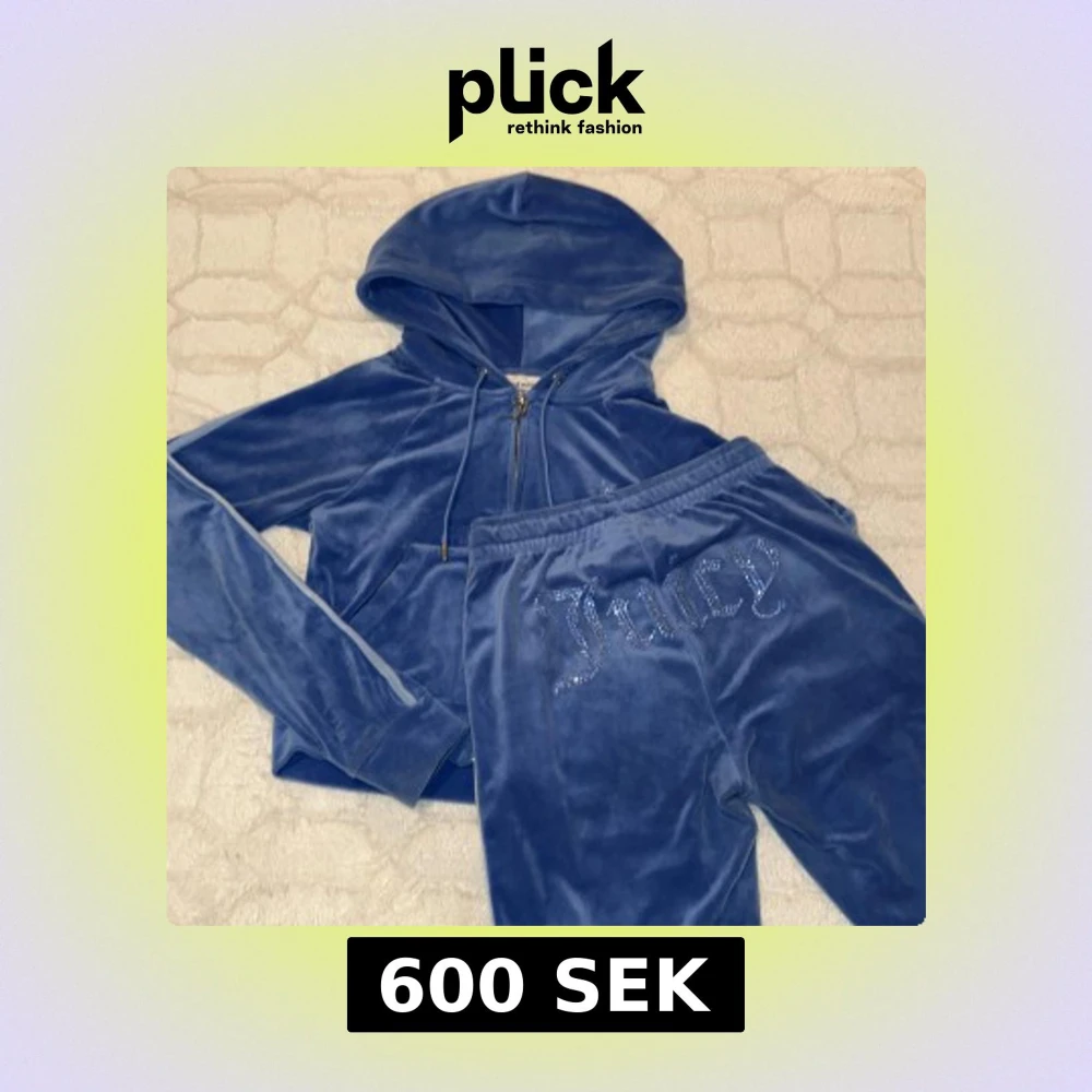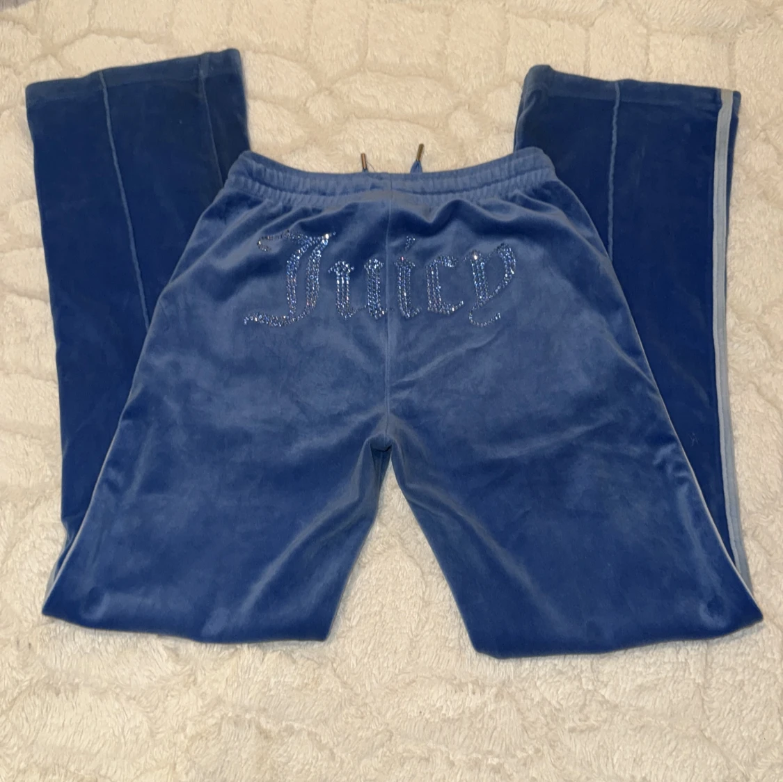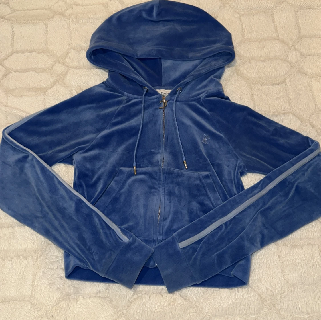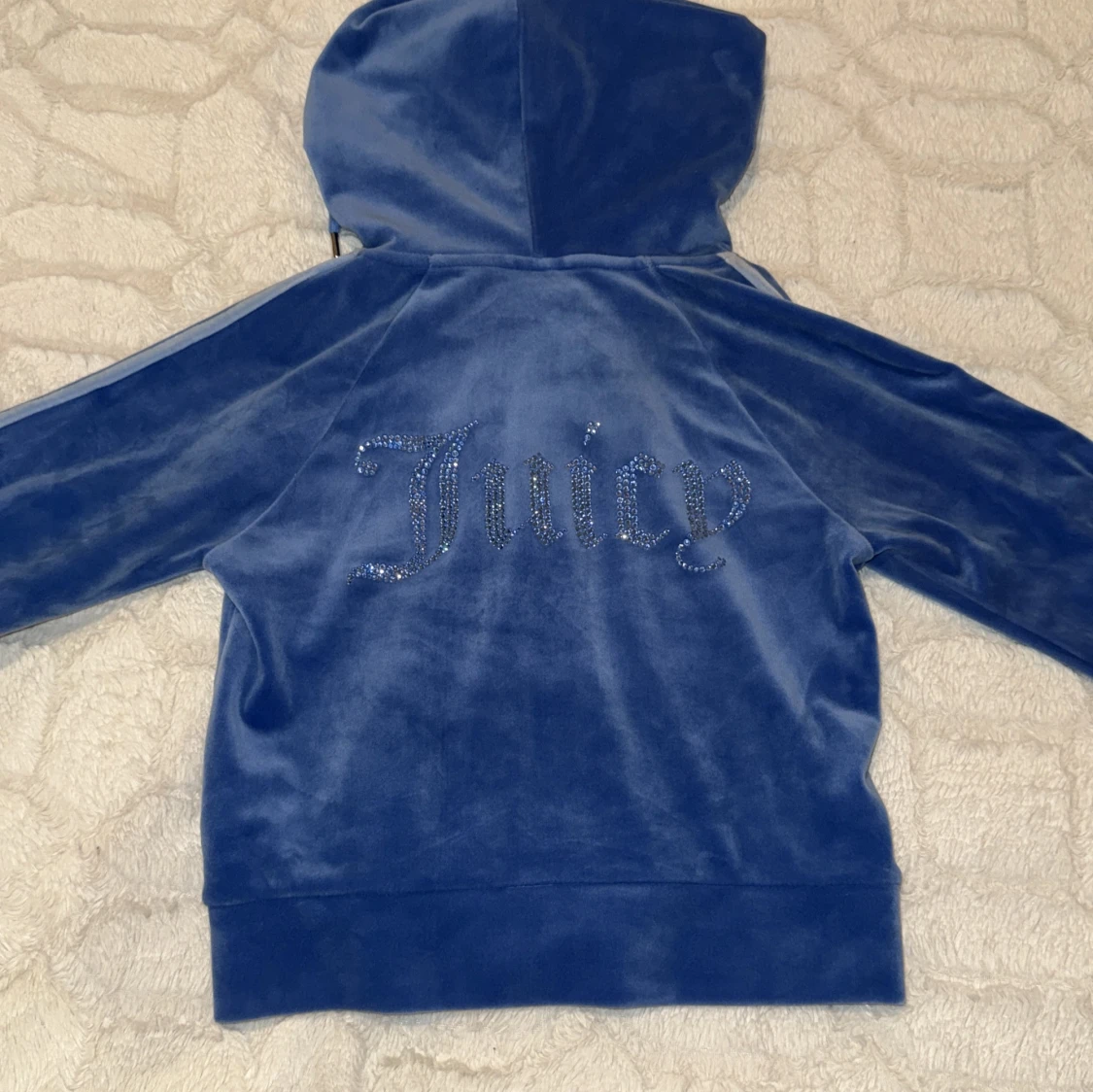 Säljer ett blåt sätt från Juicy Couture tröjan är xs byxorna är xxs med dragkedja och huva. Sättet har långa ärmar/ben med en ljusblå rand längs sidorna och texten 'Juicy' i glittriga stenar på ryggen. Perfekt för en avslappnad och stilren look.
