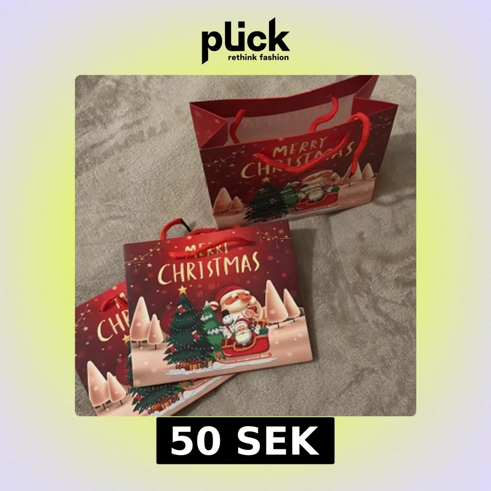 Säljer en röd shoppingpåsar med julmotiv, där tomten och en gran syns tillsammans med texten 'Merry Christmas'. Påsar har röda snören som handtag och är perfekt för att ge bort presenter i under julen.