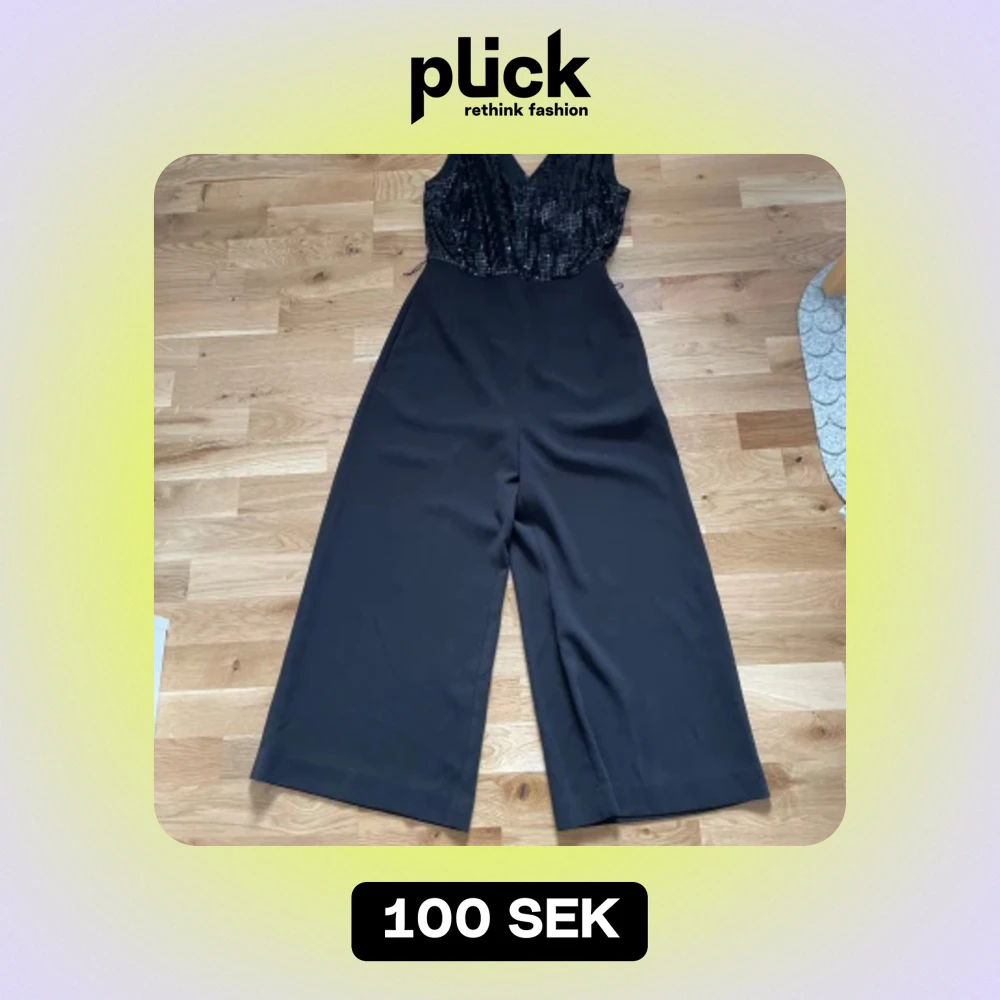 Svart festlig jumpsuit med paljetter från H&M säljes. Använd ett fåtal gånger och i gott skick. Tillhör även ett tygskärp som inte finns med på bilden. Säljes för 50 kr.