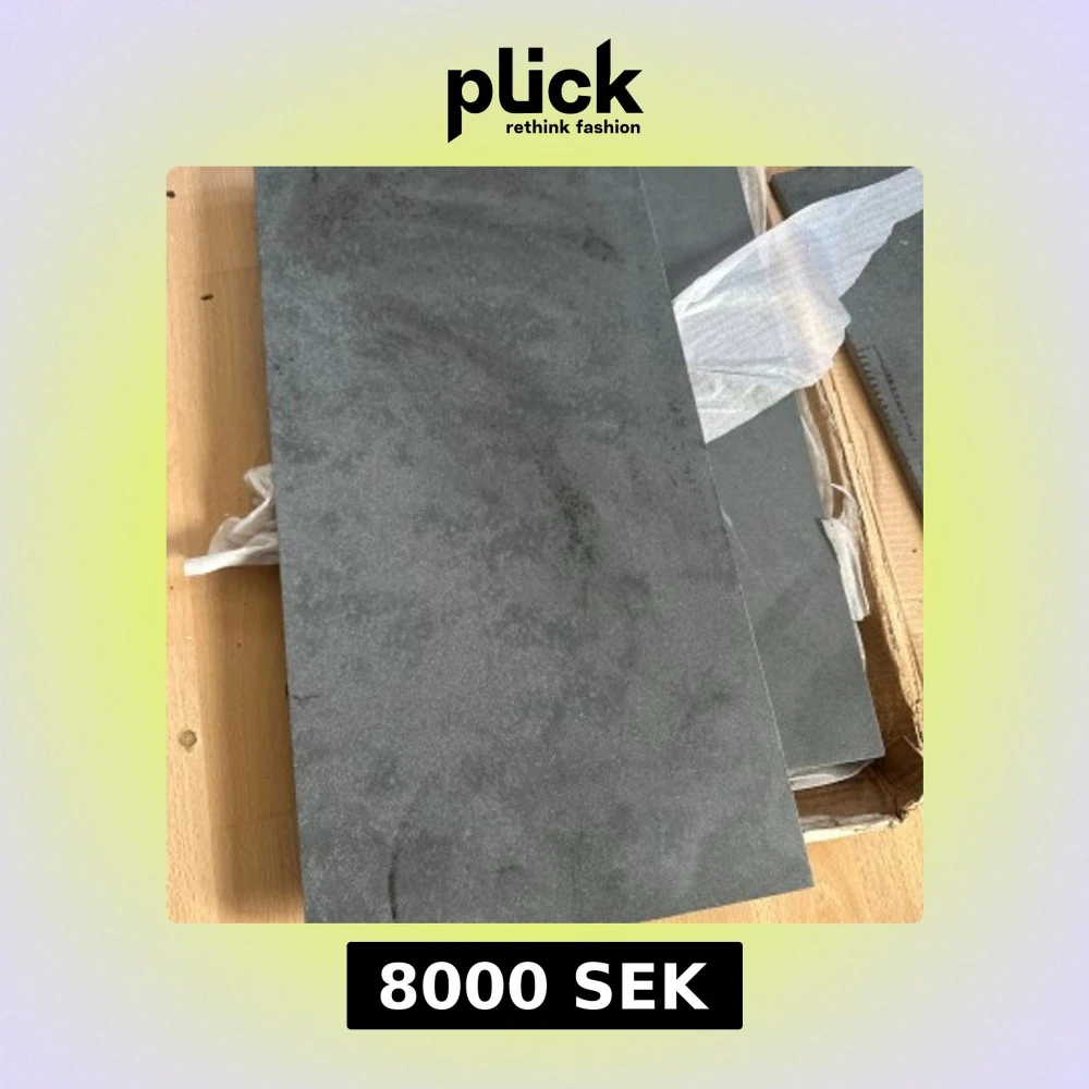 Bilderna visar svarta eller mörkgråa plattor med matt yta, troligen av sten eller keramik. De ser ut att vara oanvända och ligger i en kartong, men vissa plattor har mindre märken eller fläckar. Ingen elektronik eller teknisk produkt syns på bilderna.