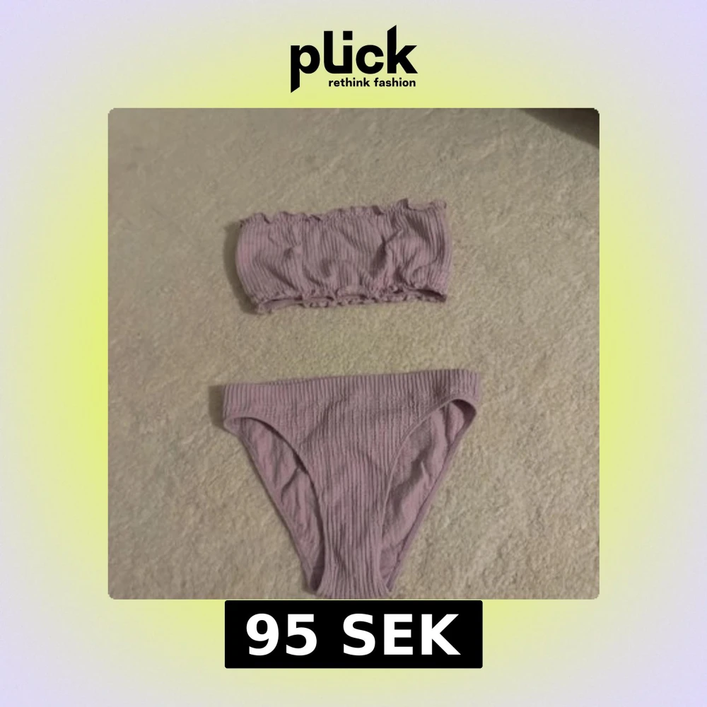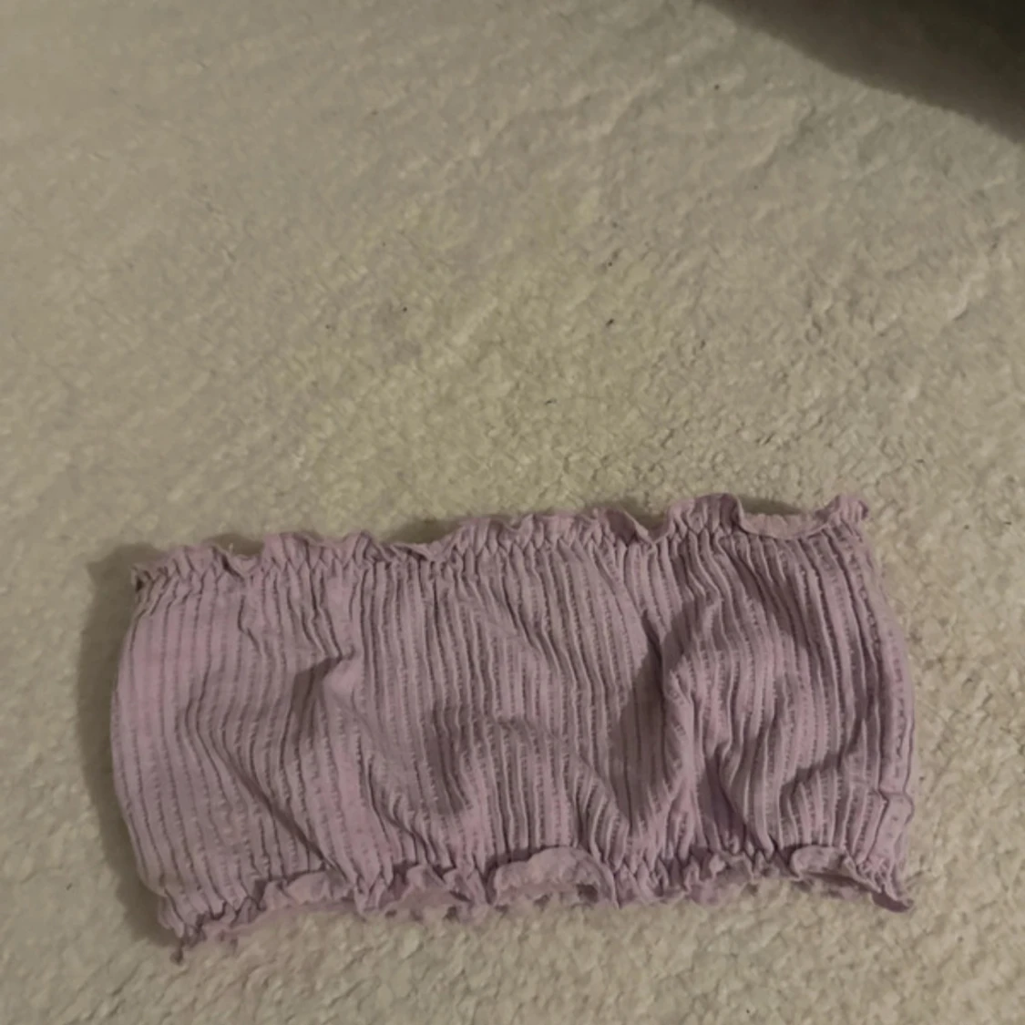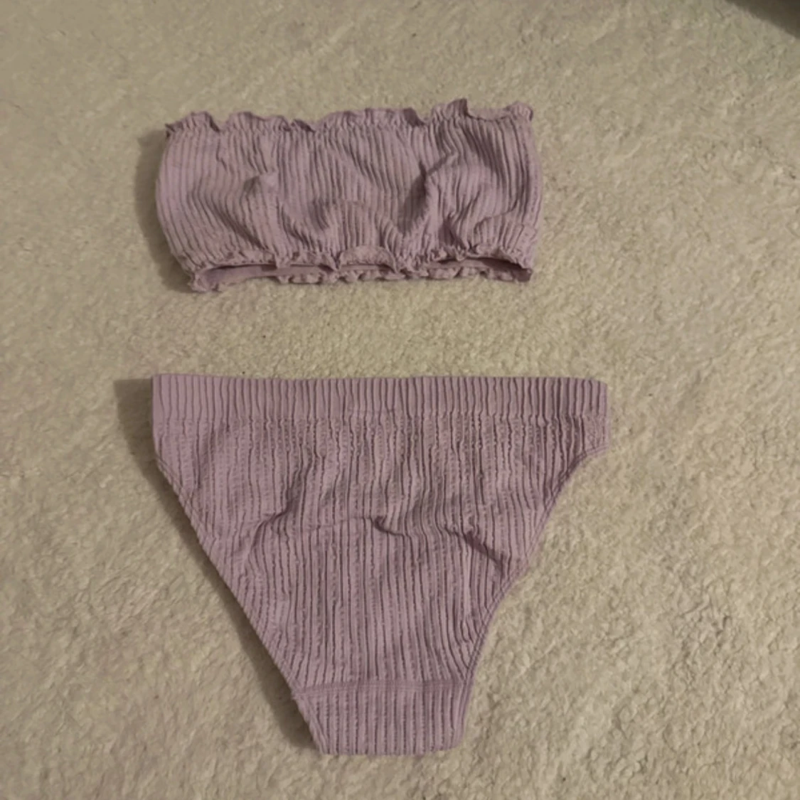 Superfin ljuslila bikini med bandeau-topp och höga bikinitrosor. Båda delarna är ribbade och har en mjuk, stretchig känsla. Toppen har volangkant upptill och nertill för en söt look. Perfekt för stranden eller poolen i sommar! Toppen är i storlek XS/S och trosan är i storlek S